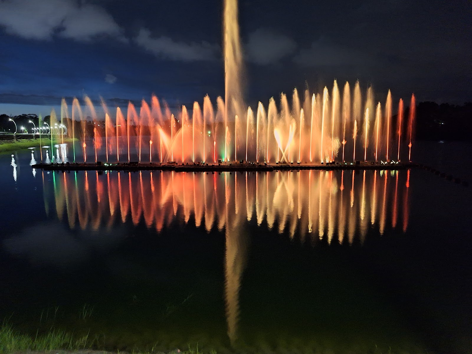 蘭潭上的水舞表演,各用中、日、英作介紹廣播。噴水配合音樂映在水面上,附近走走散步,是晚上休閒好去處