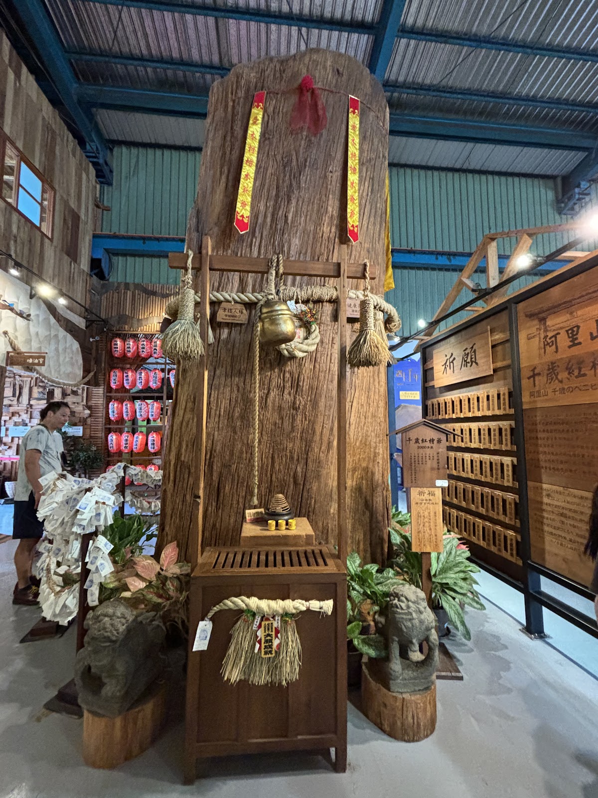 而神木旁邊有紙條,可以寫下自己的心願並蓋上神木印章,用繩子綁在神木的大繩上,有分類財富、人緣、事業、愛情、健康,可以依照自己的心願類別去綁上,地板也有木屑拼成的動物圖案。