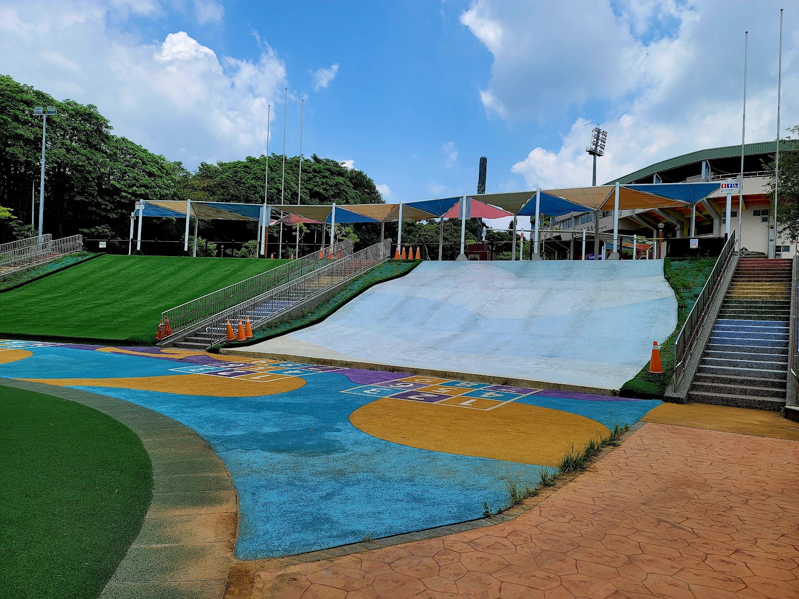 空間很大,滑草也有攤販再賣滑草墊,只是小孩很容易失控,有假草皮和軟墊,所以相對安全,只是滑梯速度容易過快,太小的小孩要注意安全,遮陽的設施比較不足