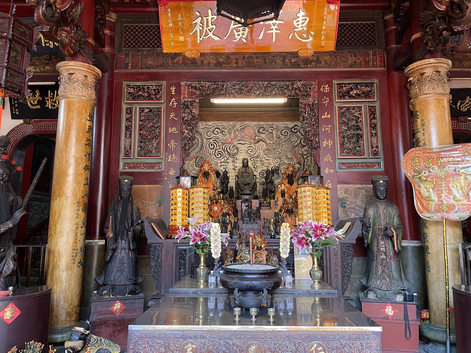 大殿主祀保生大帝,二樓觀音殿供奉觀世音菩薩、文殊菩薩、普賢菩薩。三樓凌霄寶殿供奉玉皇大帝。