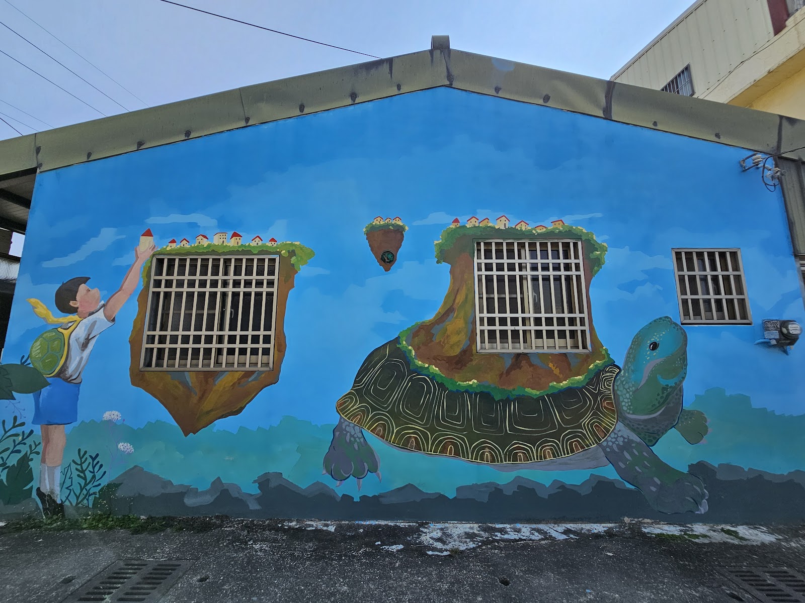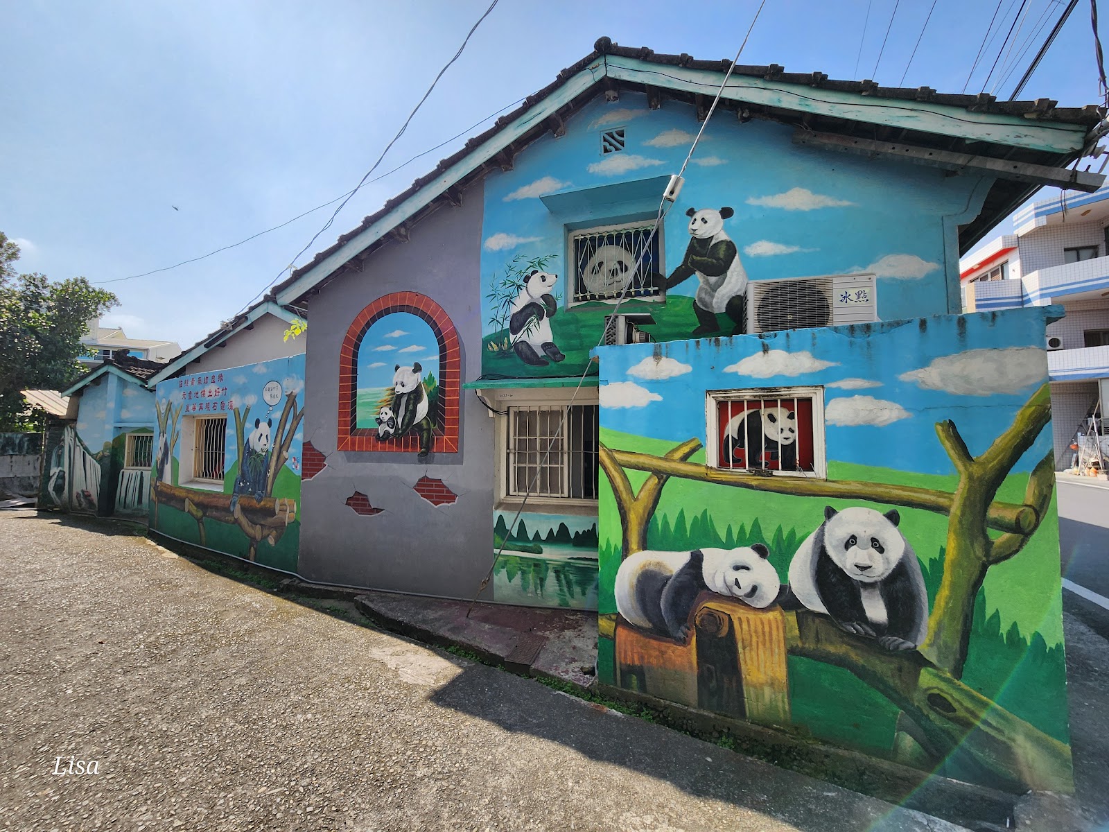非可愛路線的熊貓彩繪,國小內有可愛小石龜造景,車站外牆也有熊貓彩繪。若全村是龜彩繪應該更與地名相應.
