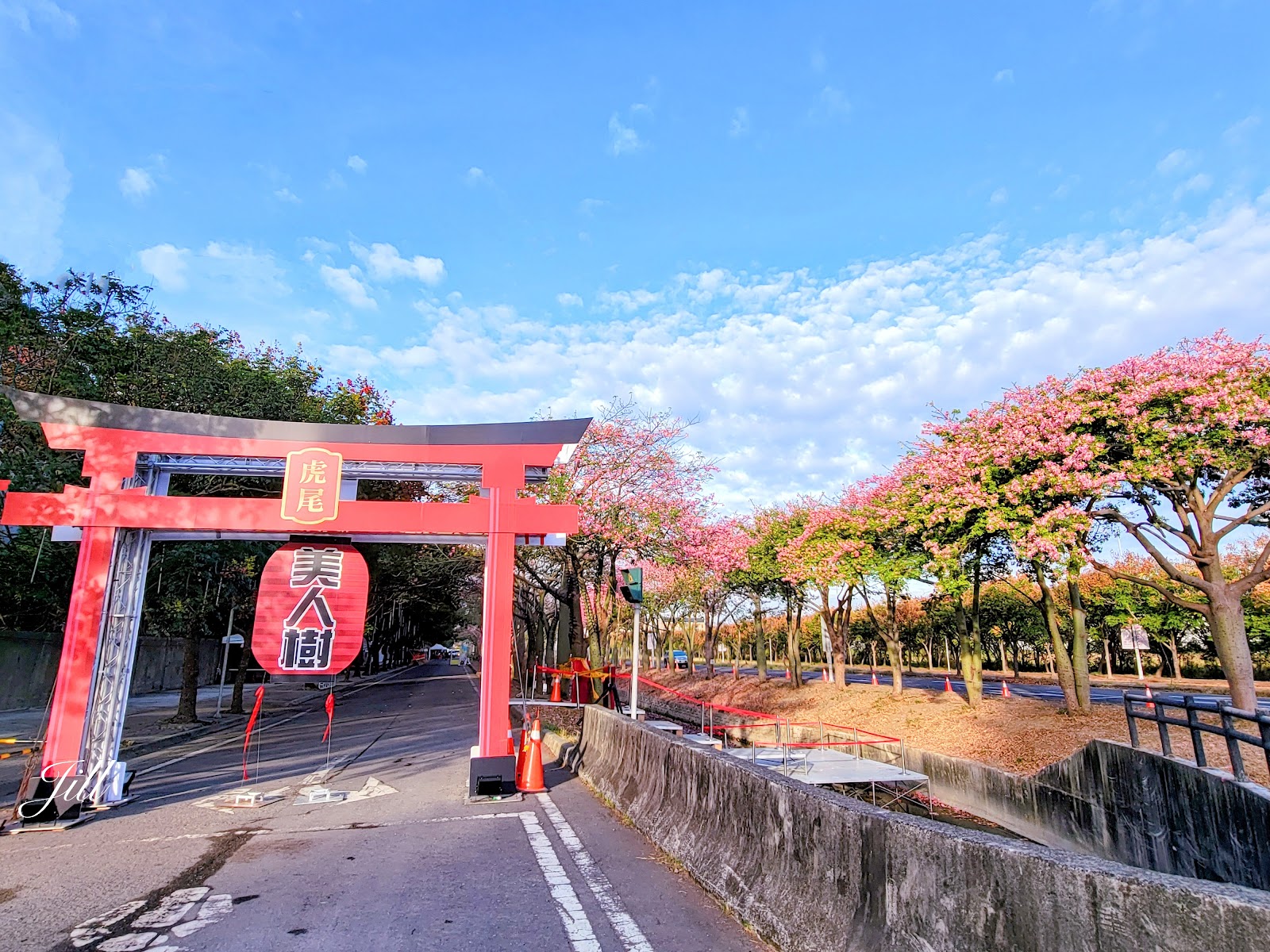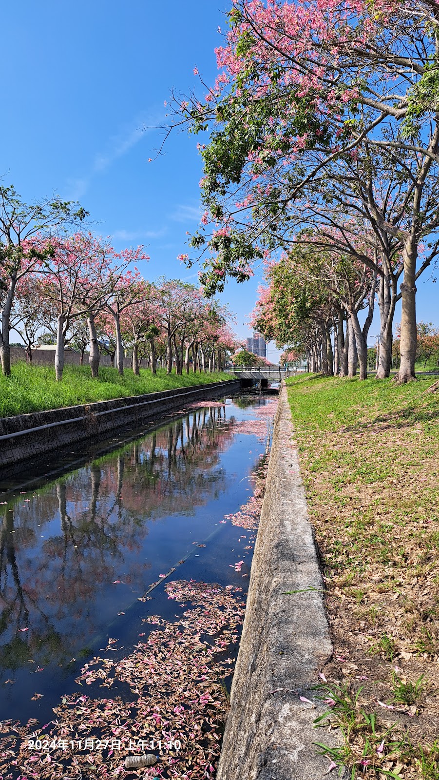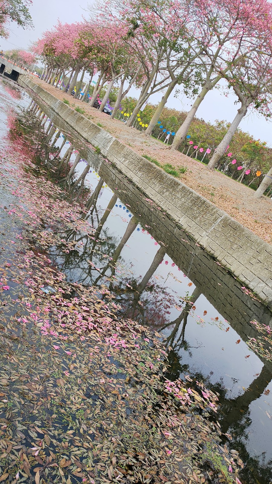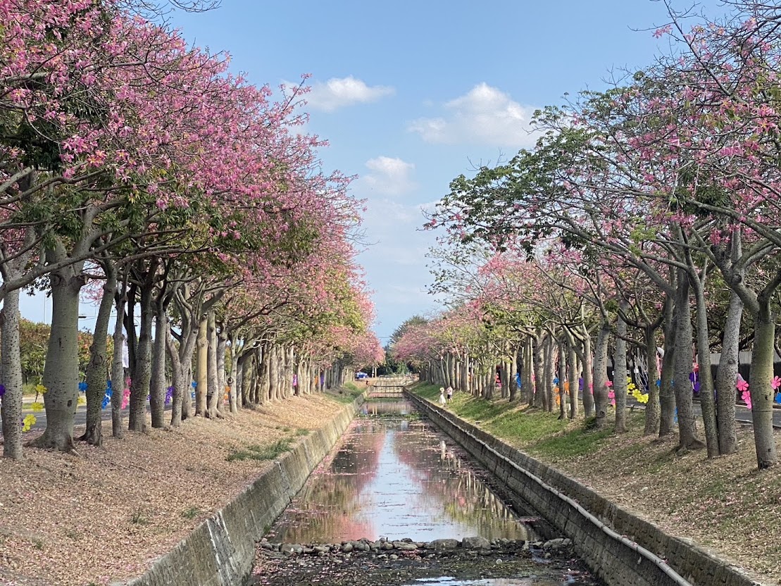虎尾美人樹大道位在雲林虎尾科技大學附近,花海大約在每年11月中下旬至12月盛開,河畔、大道上開滿粉色花海,搭配花瓣飄落在水面上的美景,不管是從橋上遠眺、渠道邊漫步,都讓人彷彿置身櫻花海中,吸引花海控前往取景。