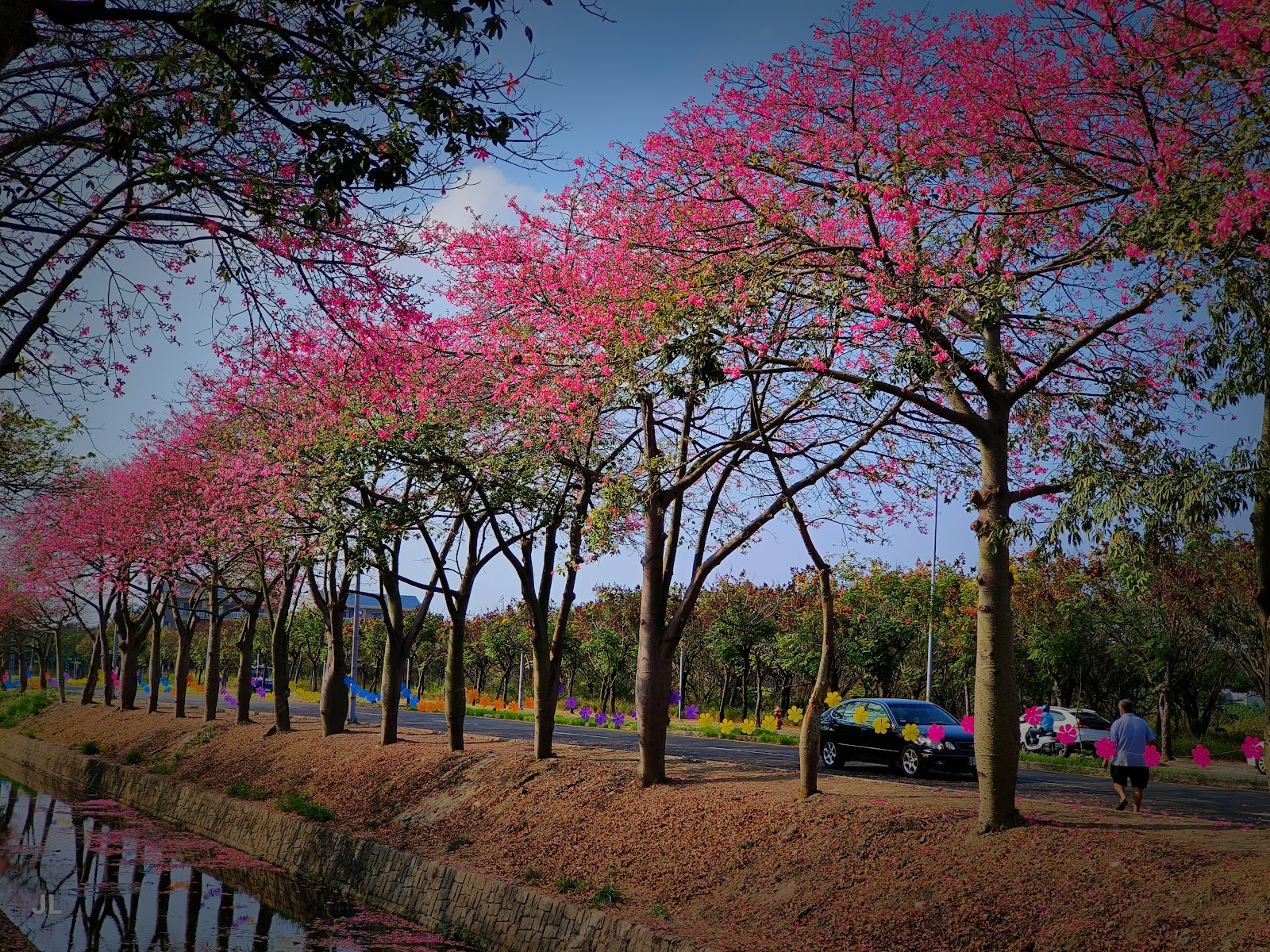 每年11月下旬,美人樹盛開時期,遇到好天氣,拍起來更美。路邊好停車,平日人少好好拍
