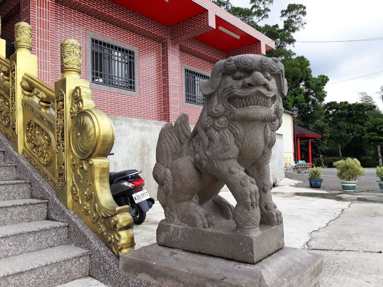 廟前的石獅是原本神社的「狛犬」,從下方搬到這裡來放,狛犬下方原本的石臺子放廟的虎邊(租日本浴衣的前方)。但神社的狛犬被誤認成石獅後,擺放位置變成朝前,左右位置也被換掉,原本狛犬的擺設是面對面,張嘴的代表「阿」應該在龍邊,閉嘴的代表「吽」,應該在虎邊。