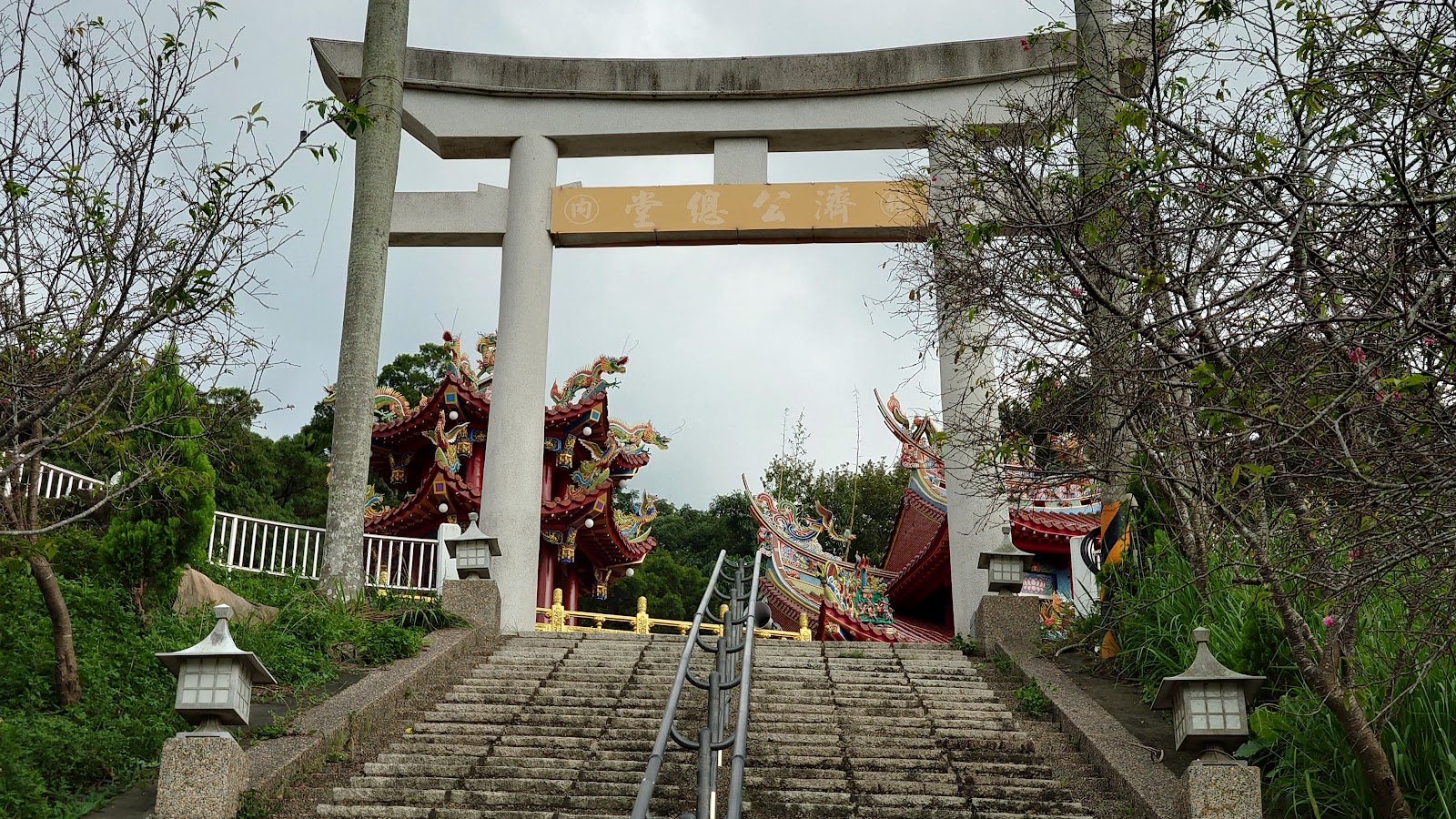 原為林內神社,建於1940年,當初有4座鳥居,前兩座明神鳥居在加個屋頂的狀態下,得以保留至今,第三座在濟公廟前面,是新蓋的,並不是遺跡,而第四座是早已隨著神社本殿消失的木造鳥居,在第二座鳥居的樓梯下方有發現神橋,不曉得是不是當初留下來的?如果是的話,應該只是下方的小溪被填起來,各位如果有空可以上網看看歷史照片,或親自走訪一趟林內公園,想像一下當初的林內神社是多麼的壯觀,光看第一座鳥居就知道,大約四層樓高。