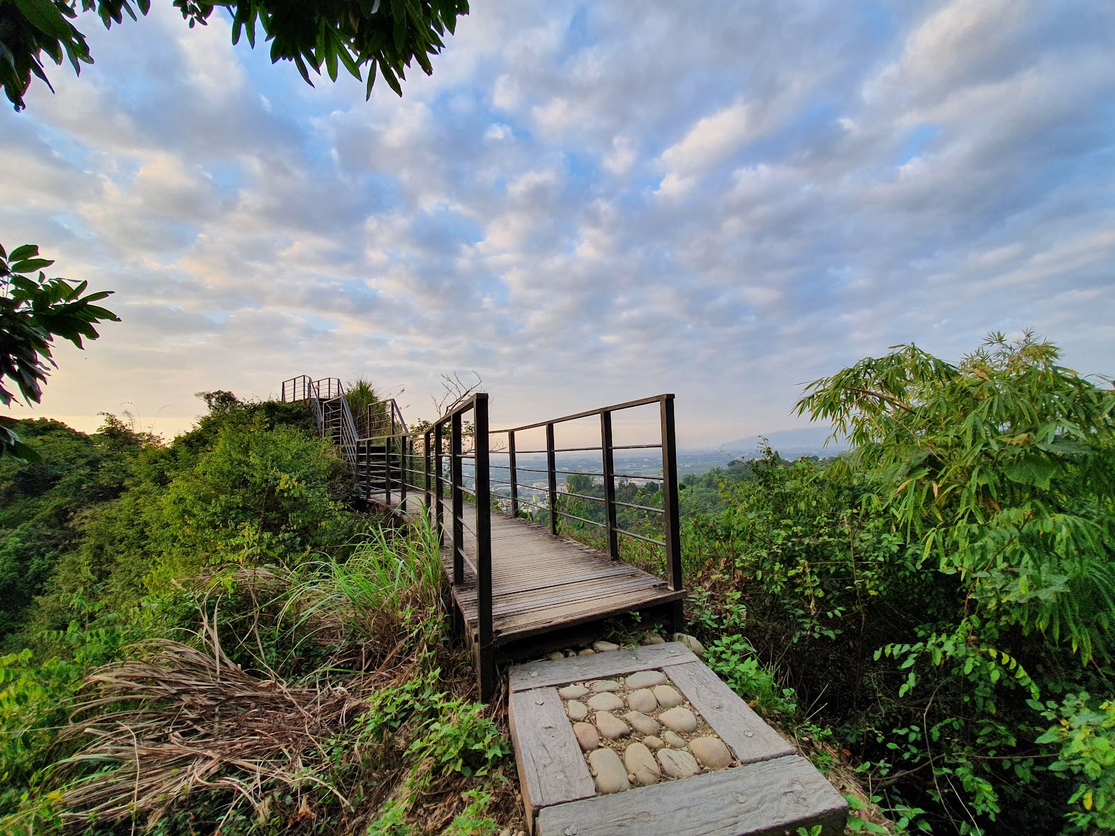 公園融合龍過脈步道,交錯的支路彰顯山林間生態豐富,午後吹著冷風,持續走在綿延陡坡的階梯上還是會微微冒汗,眺望山下街景很美,視野遼闊。