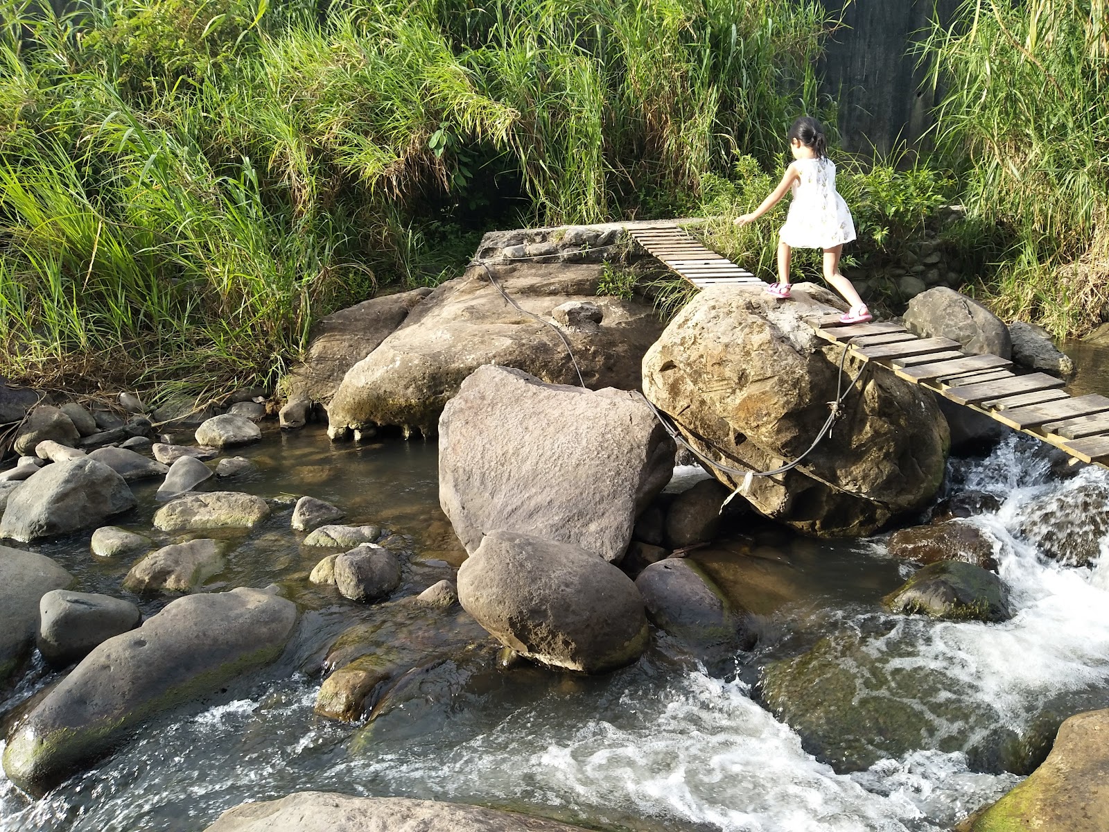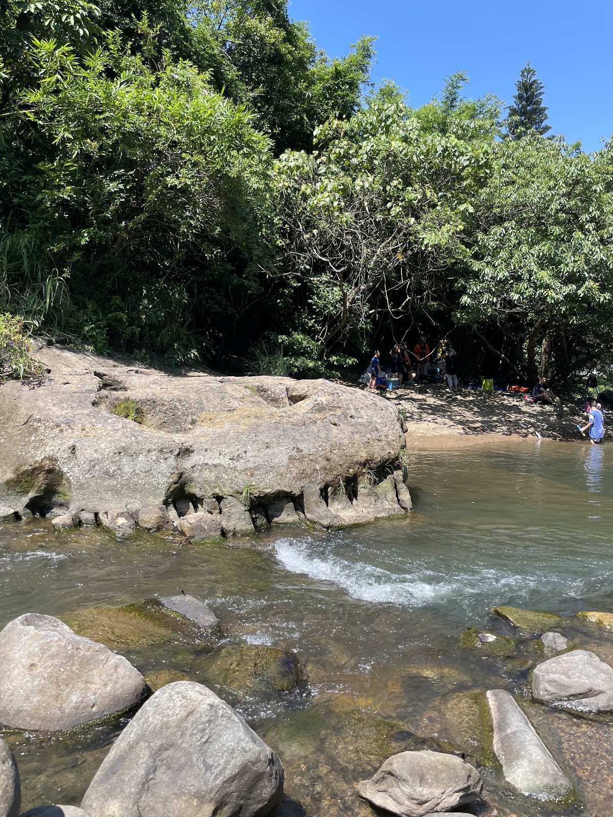 小小孩不適合。小學二年以上比較適合。水不深對岸比較適合駐足遮陰。但過到對岸需要跨過幾顆石頭,石頭距離遠且有青苔,千萬要注意濕滑。附近用餐可以去車輪釣蝦場,釣蝦場有熱炒。