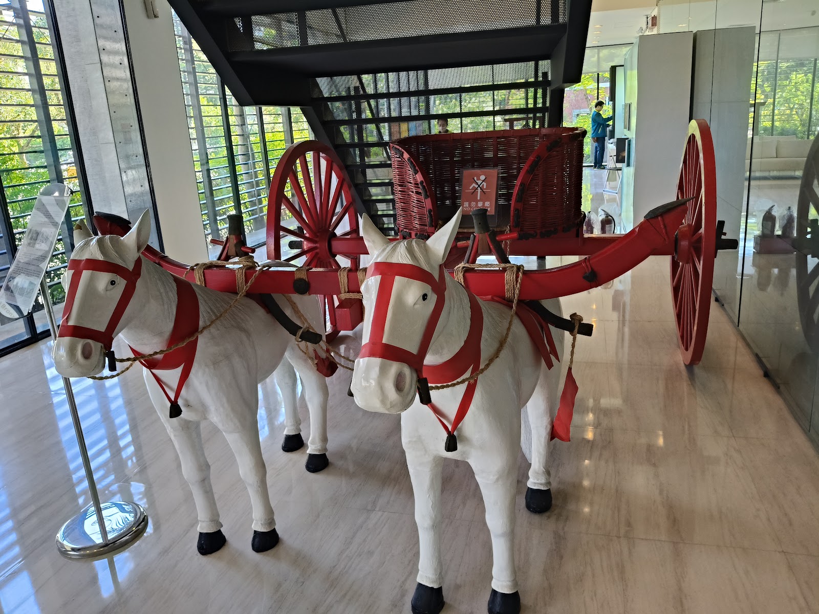 入口櫃台旁有依殷商車墓馬坑遺物做的馬車模型,原來當時的車座(車輿)為方形藤編,登車口在前,與後期在後的不同。一旁照片解說,敘及還原組合時的試駕情形。