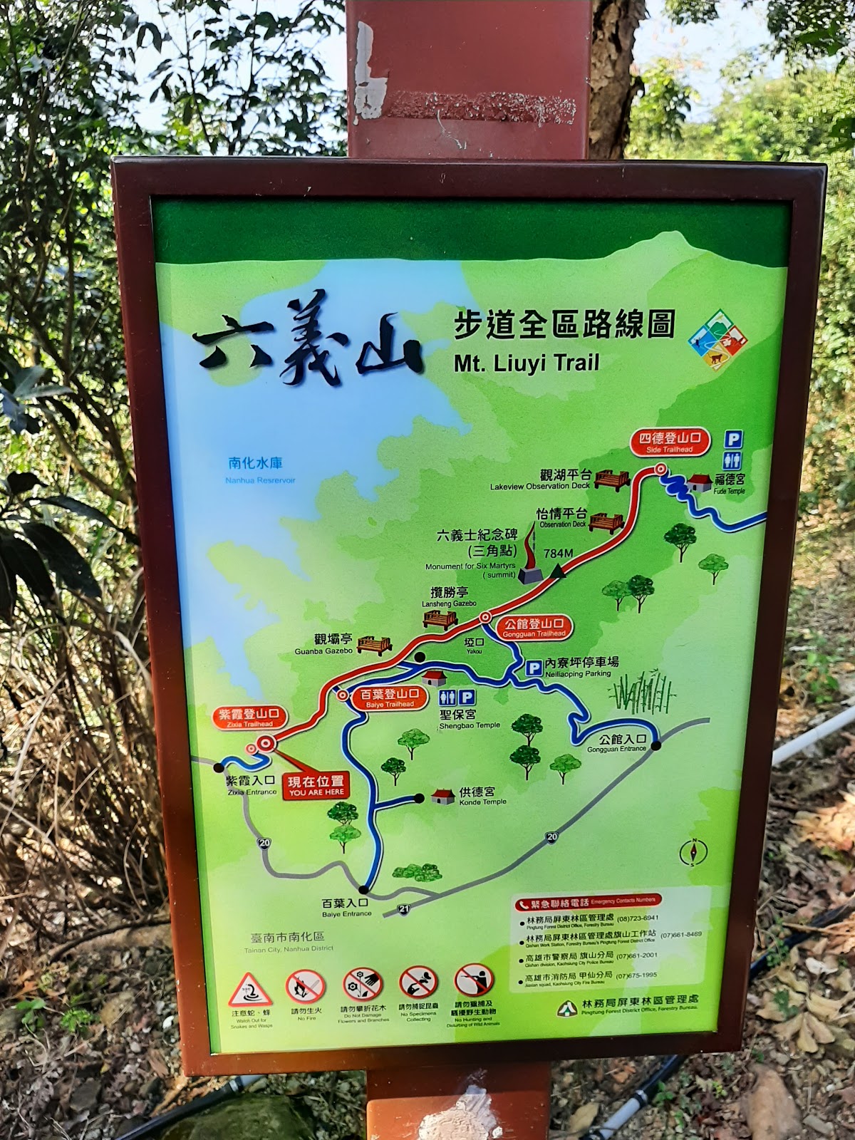 個人習慣從此登山口爬六義山,時間充足的話可走到尾端的四德登山口,若只是要運動一下,走到觀壩亭看一下南化水庫休息一下,就可以回程了。