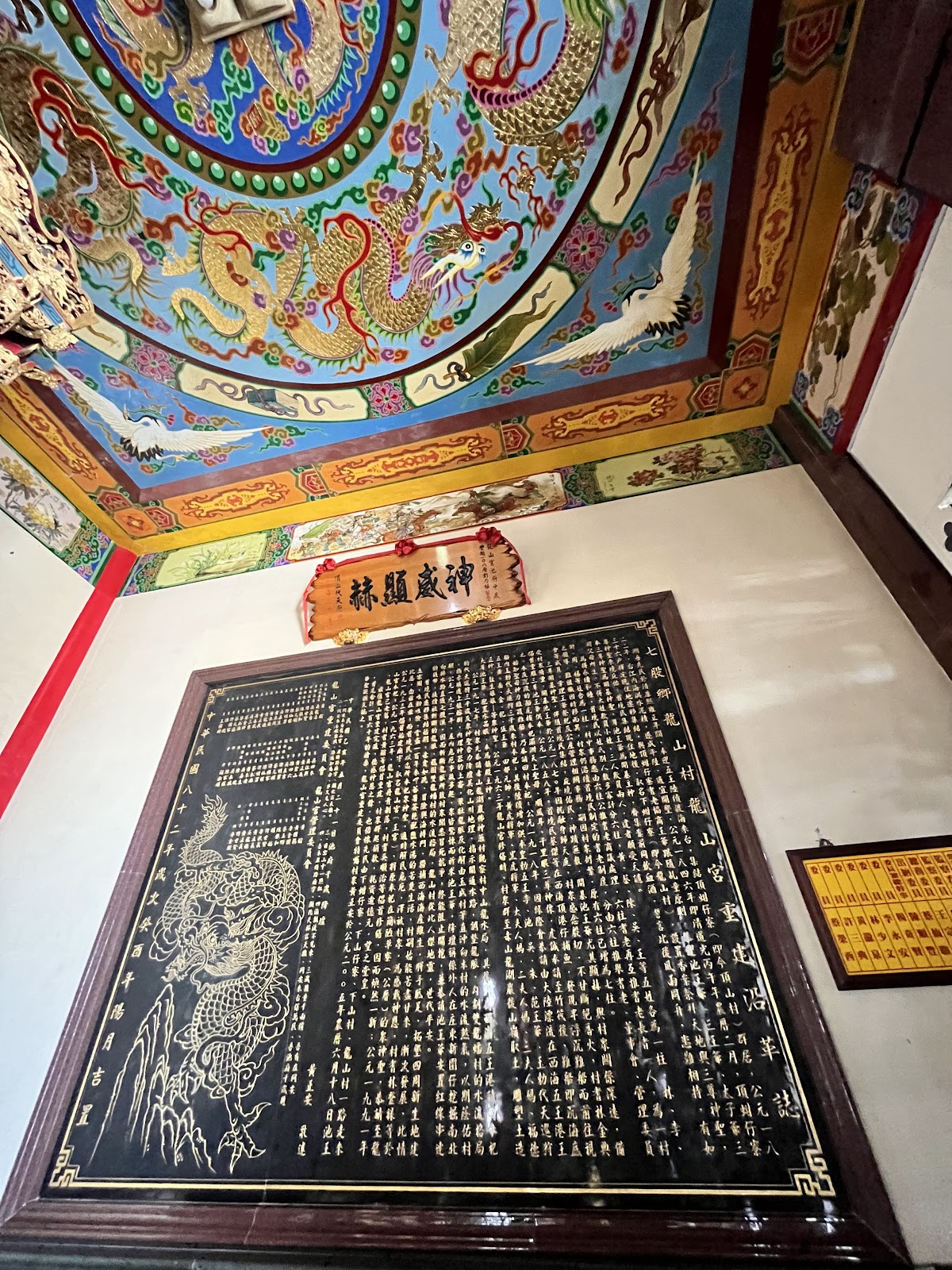 龍山宮內部擁有著富麗堂皇的裝潢,抬頭能看見精緻的藻井,牆面上還有壁畫等吸睛裝飾,富有傳統建築之美。