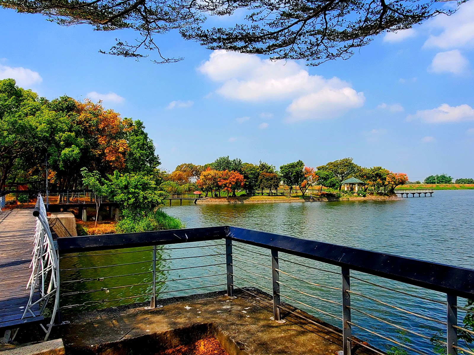 湖光十色,美景盡收眼底。樹木茂盛可遮避強烈陽光開心的散步,還有吊橋另一頭有二片菱角田。還有荷花池,花苞累累,尚未盛開。有二座兒童遊樂場所。還有甘仔店,專賣童玩東西,還有菱角冰。