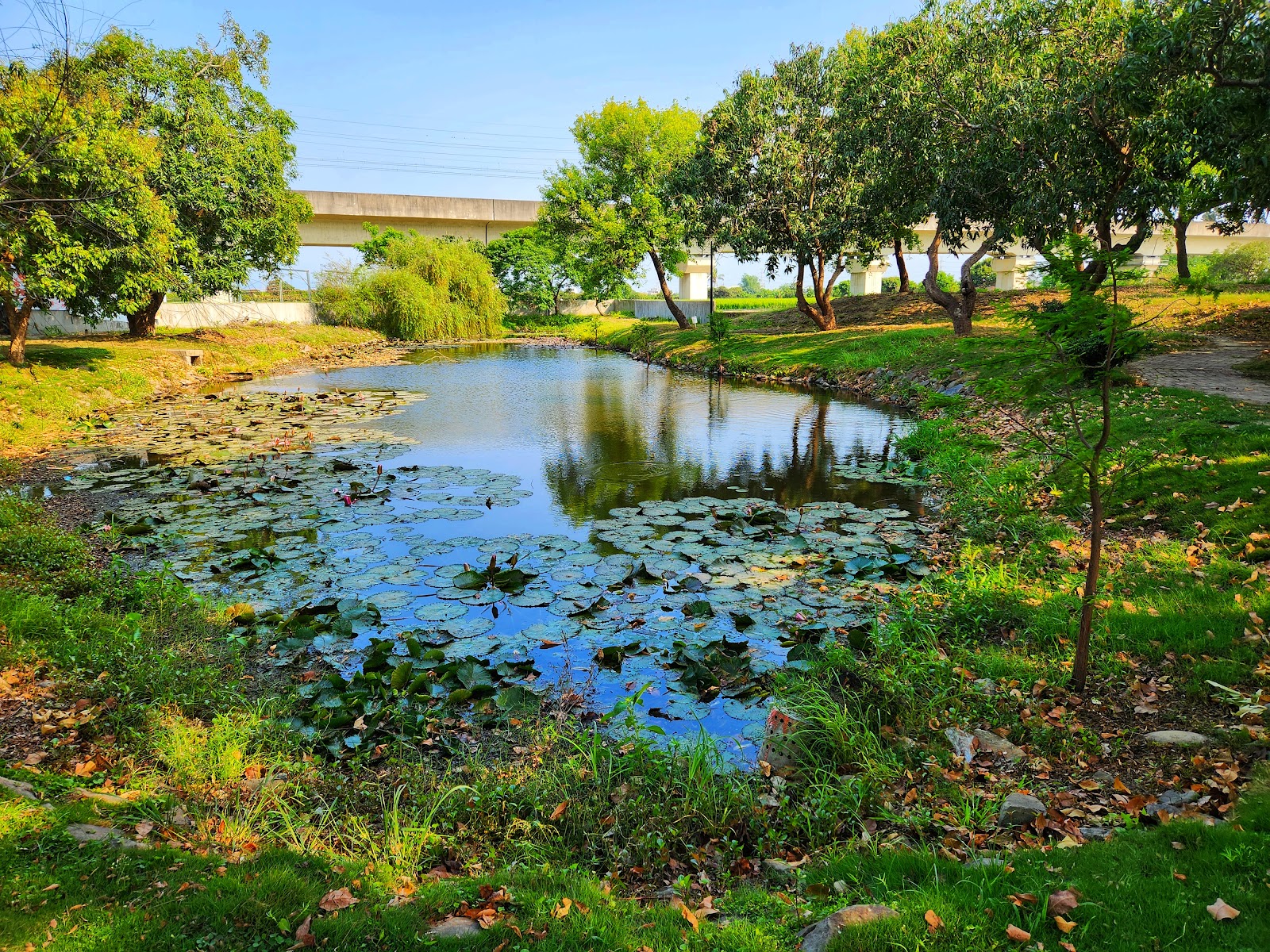 在地維護甚佳的埤塘,湖光與吊橋,岸邊種植常綠樹種,被周圍菱角田所包圍,是午後放鬆的好地方,但須注意蚊蟲叮咬。