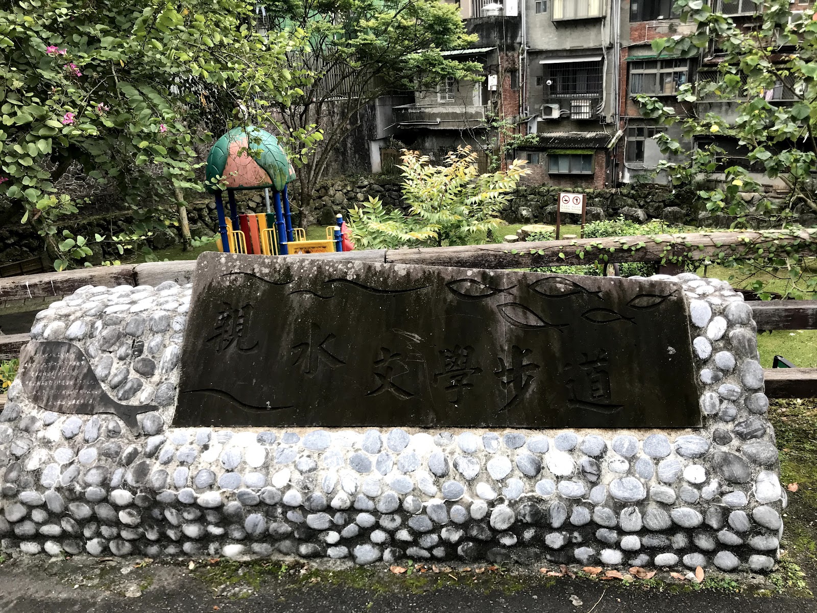 小坑溪親水文學步道的啟點入口,除了有清新優美的親水步道外,也有兒童的遊樂設施,非常推薦帶孩子來此遊玩體會溪水之美。。