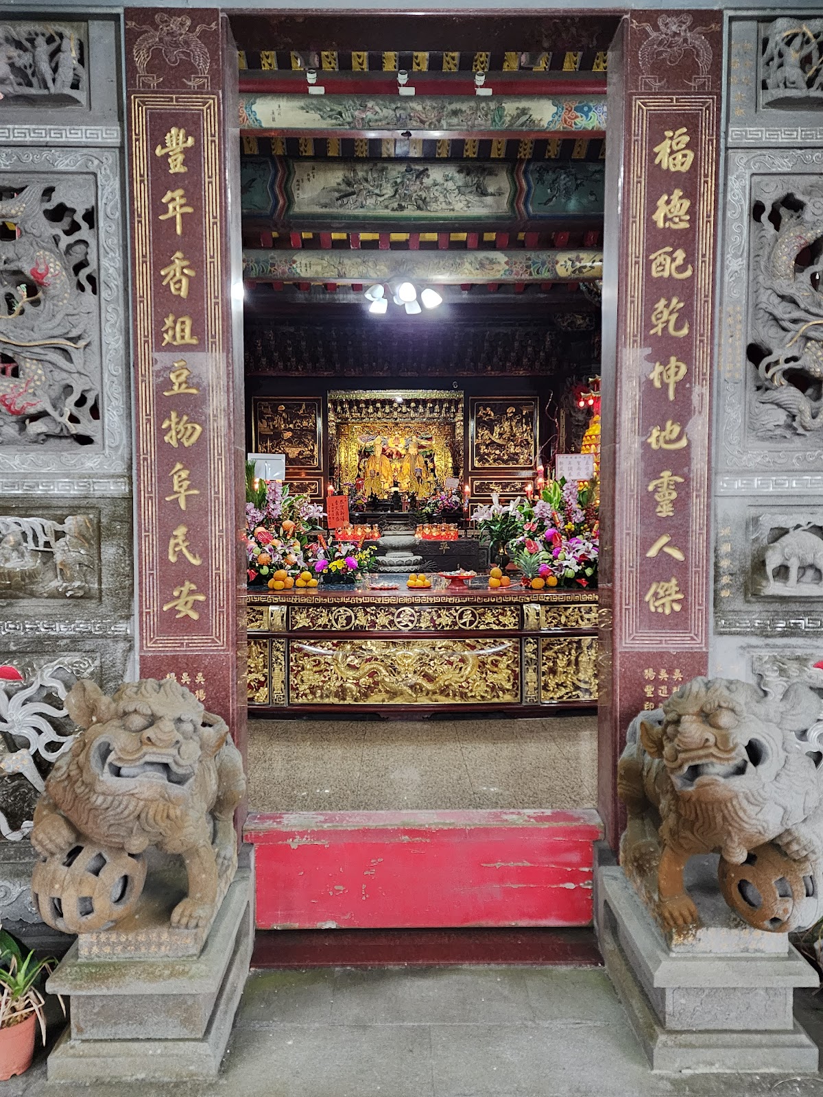 主祀土地公、土地婆,寺廟內不准拍照,寺廟裡的裝飾吊飾都非常的精美漂亮,寺廟內門神雕刻非常的精美。