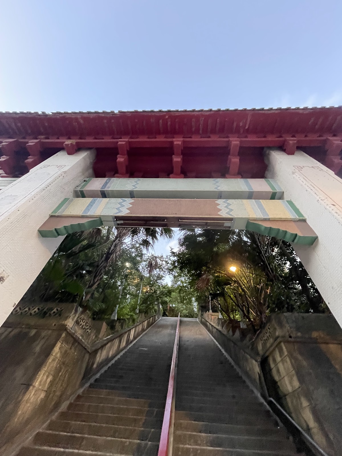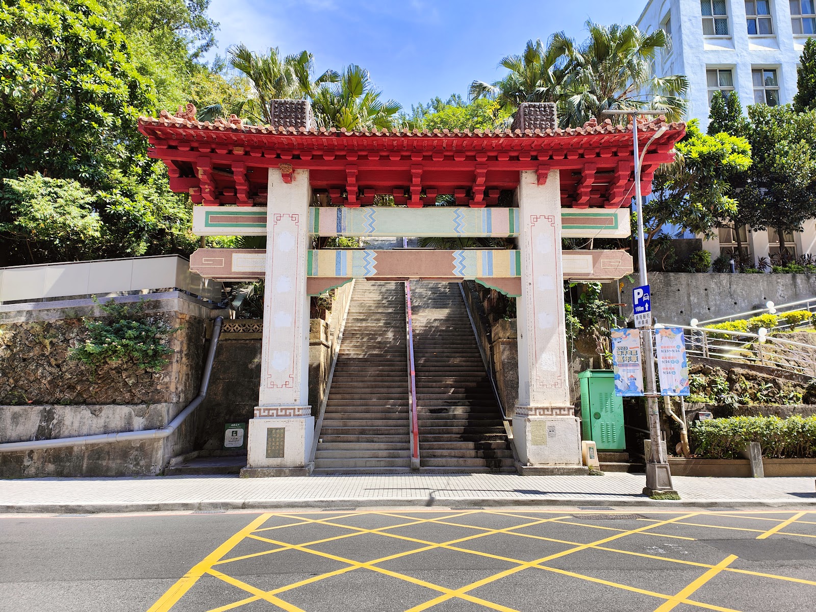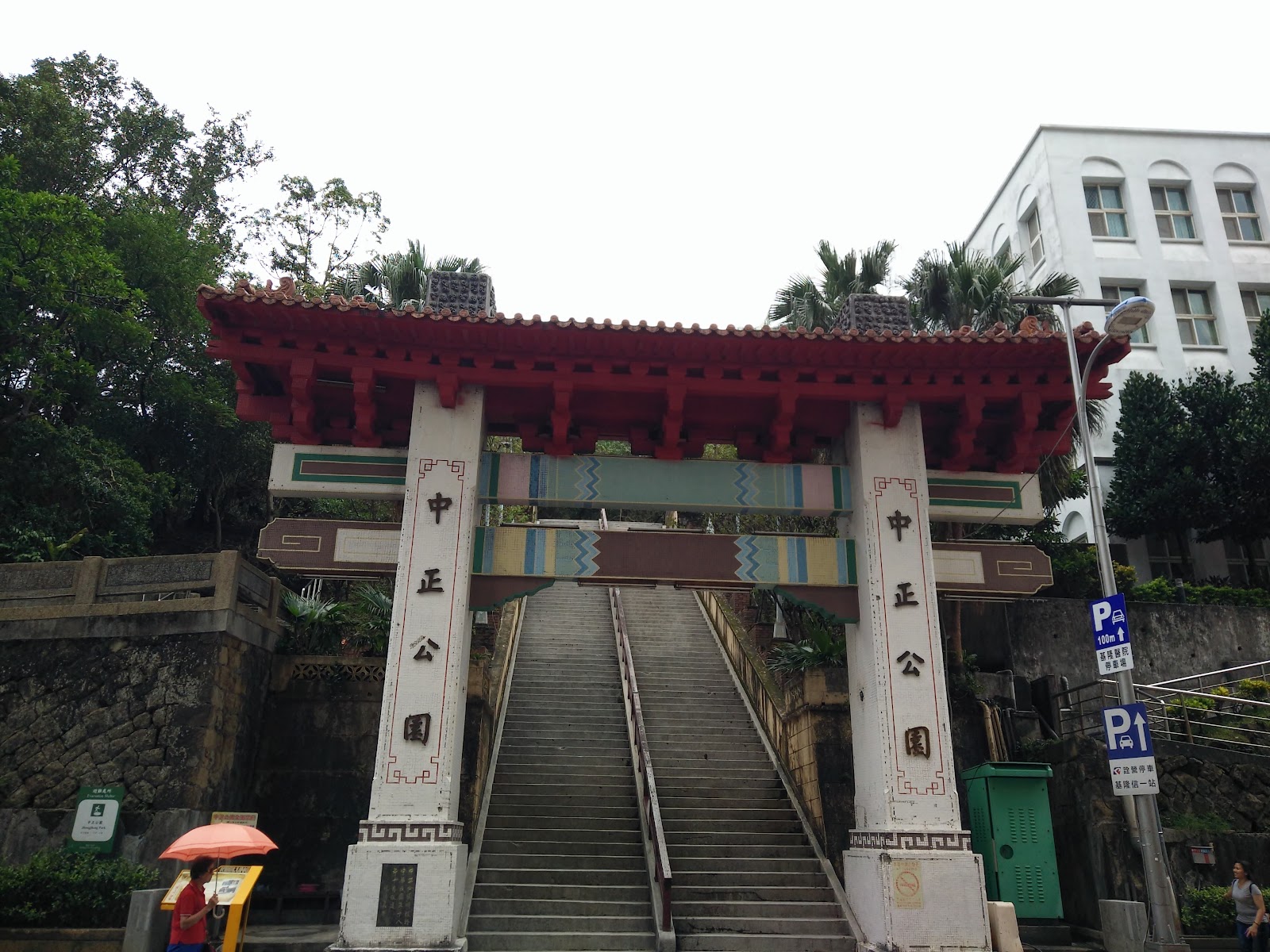 一眼望不盡的樓梯,上面是忠烈祠,也可以延著山路步道,前往主普壇和基隆塔,牌樓旁邊是二信防空洞,對面是停車場
