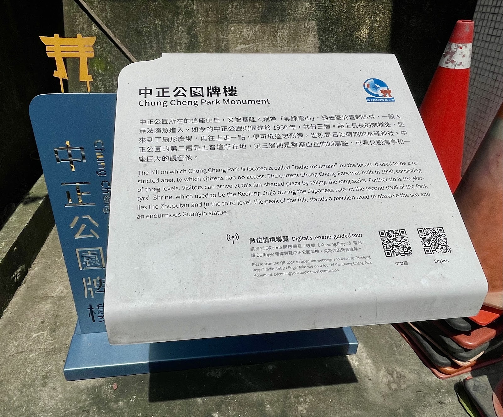 中正公園所在的這座山丘,又被基隆人稱為「無線電山」,過去屬於管制區域,一般人無法隨意進入。如今的中正公園則興建於1950年,共分三層。爬上長長的階梯後,便來到了扇形廣場,再往上走一點,便可抵達忠烈祠,也就是日治時期的基隆神社。中正公園的第二層是主普壇所在地,第三層則是整座山丘的制高點,可看見觀海亭和一座巨大的觀音像。