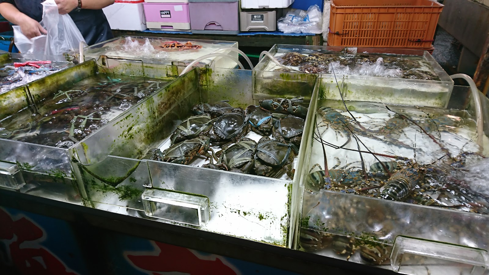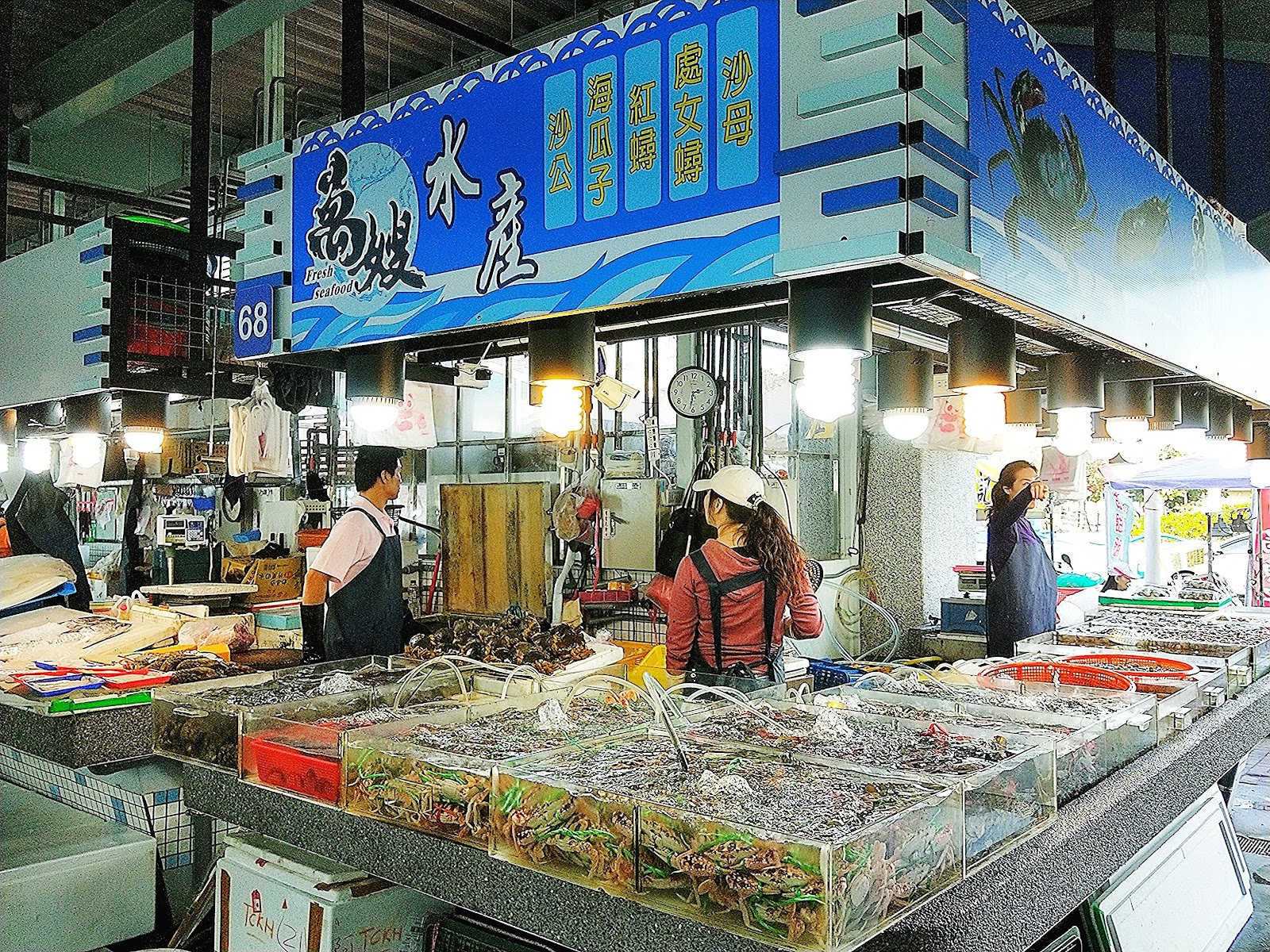 雖然整體沒有到很大,但上門的遊客不少,這裡絕大多數的海鮮都有明碼標價,超讚,不用擔心價格問題,也有公秤供民眾使用,有生鮮,有熟食,冷凍漁產,烏魚子都有,我最有興趣該是甲殼類了,螃蟹,龍蝦,貝螺類是大宗,魚其實也不貴,可惜我自己一個,不然買幾盤魚,選些蝦蟹去代客料理,那該多滿足啊!