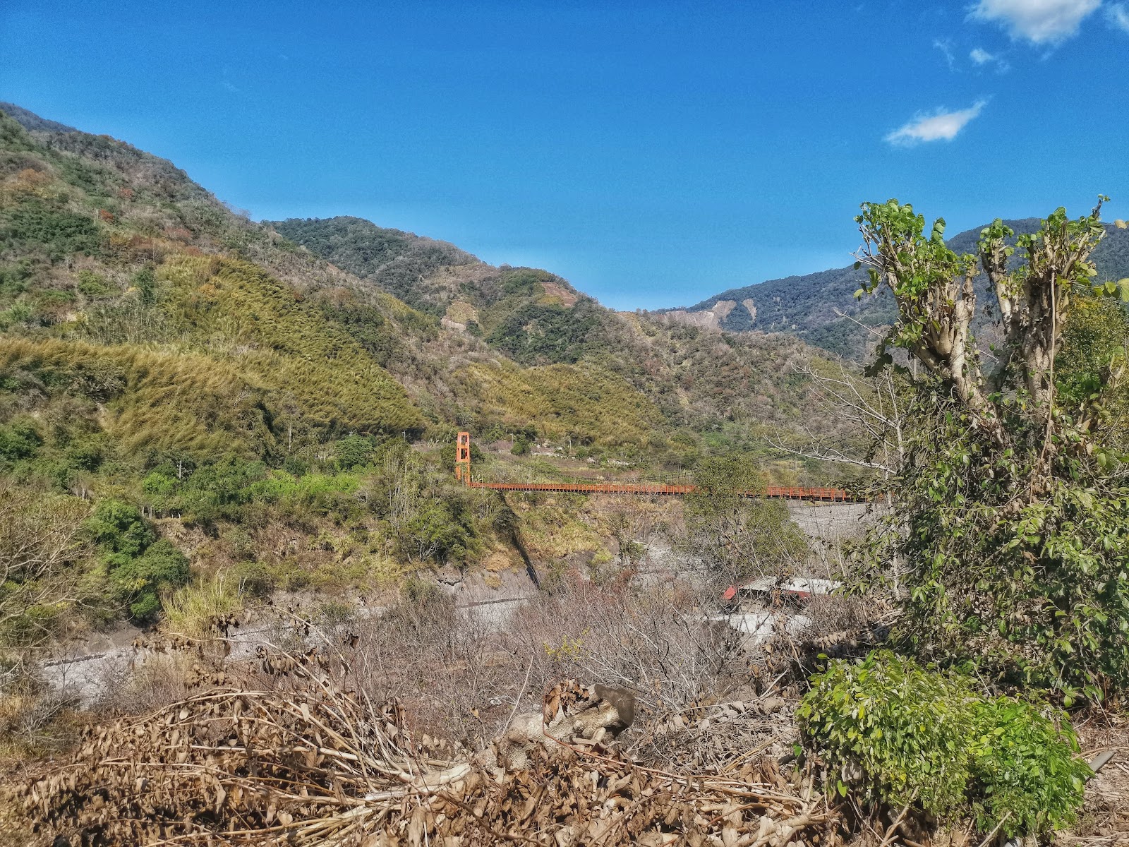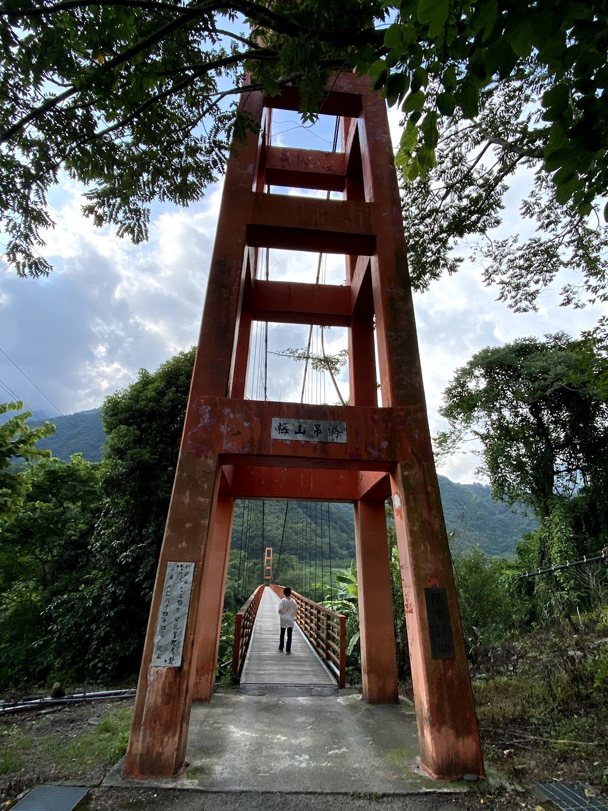我不知道南橫有管制時段(難怪沿途的車都開很快還超我車,原來真的是趕時間) 等到了梅山口才知道無法前進了⋯⋯沒辦法,只能在附近繞繞逛逛了。然後來到梅山吊橋,很老舊的一座吊橋,不過真的可以開車上去喔(當地居民都這樣走)