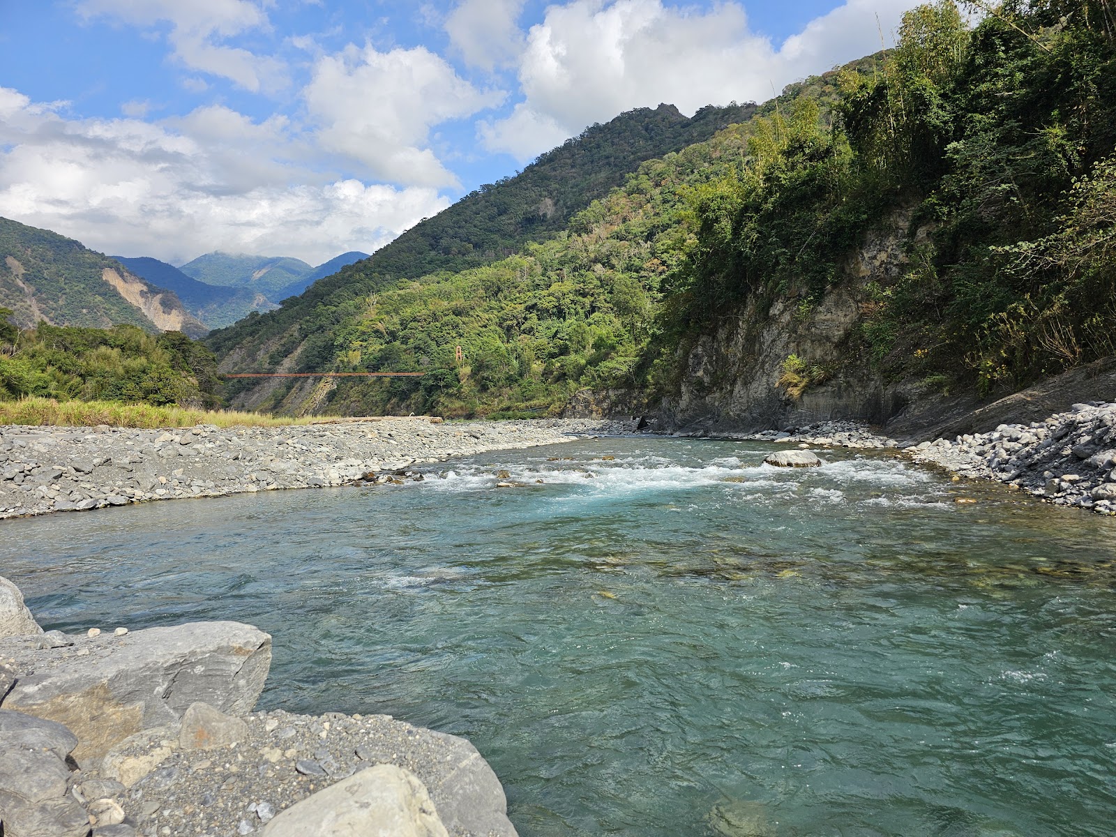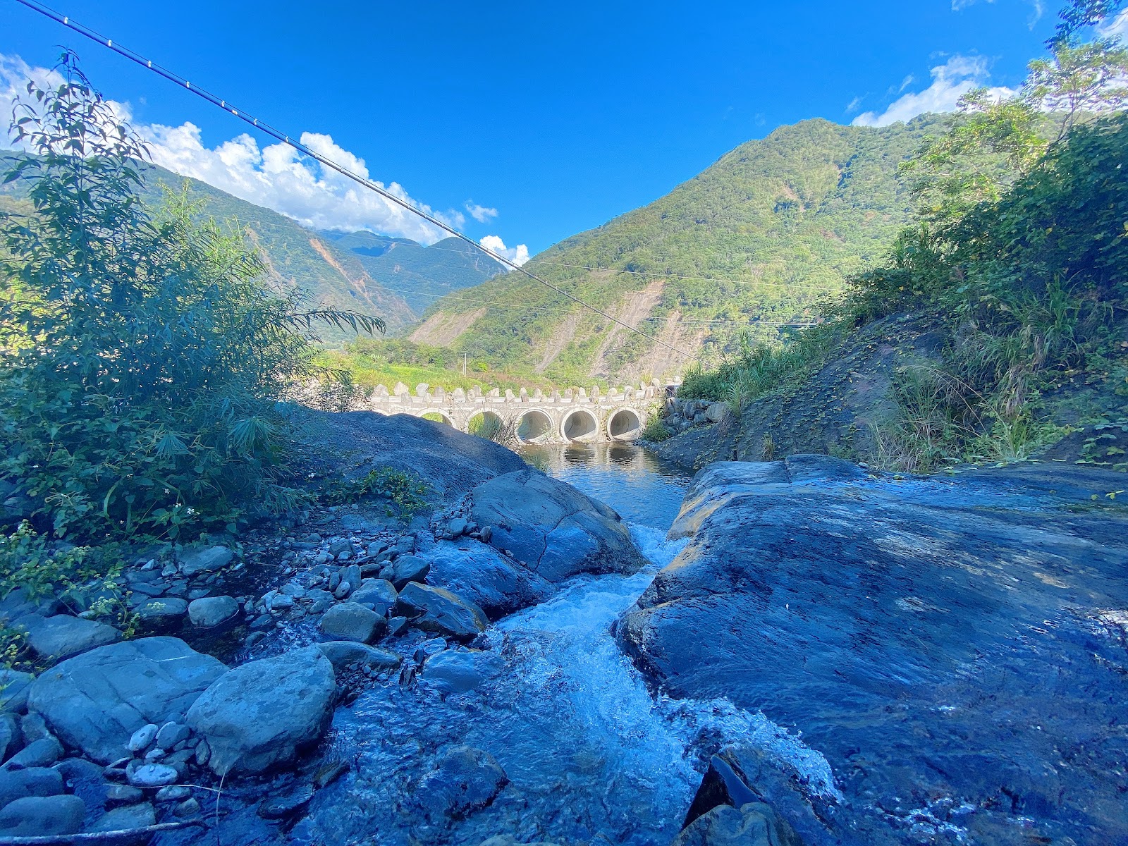 走到吊橋上 看兩側的溪流和群山環繞很美