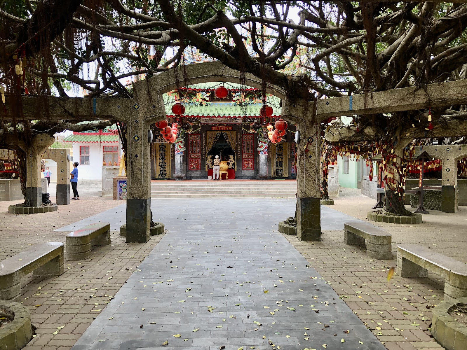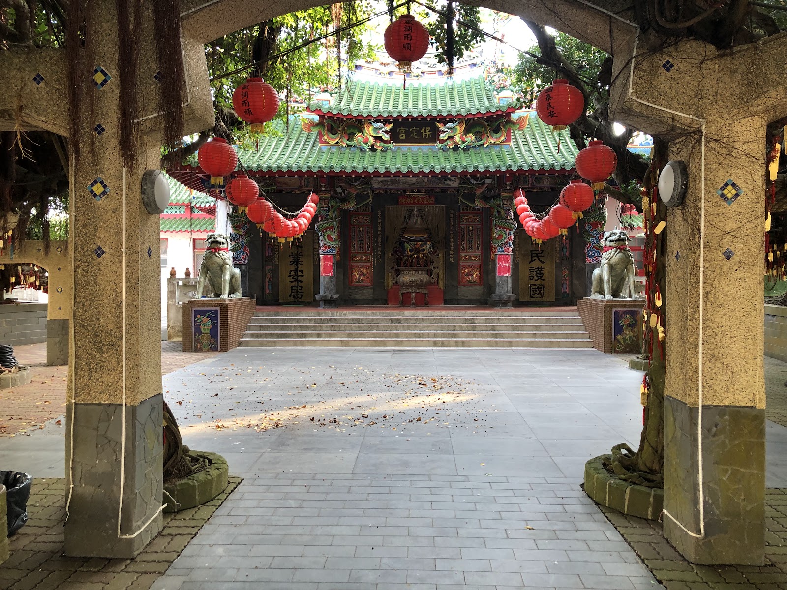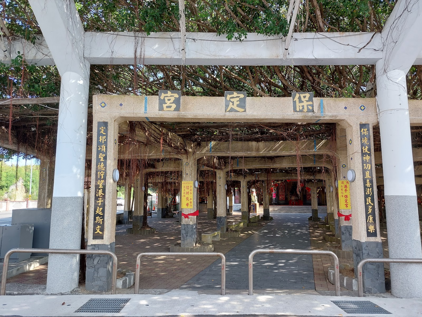 港子村保定宮,廟埕有兩顆百年老榕樹,即夫妻樹?由於東北季風強烈,澎湖榕樹林蔭廣卻長不高,樹木長到一個高度就會被季風帶往橫向生長,榕樹所環抱出的林蔭很適合休憩。