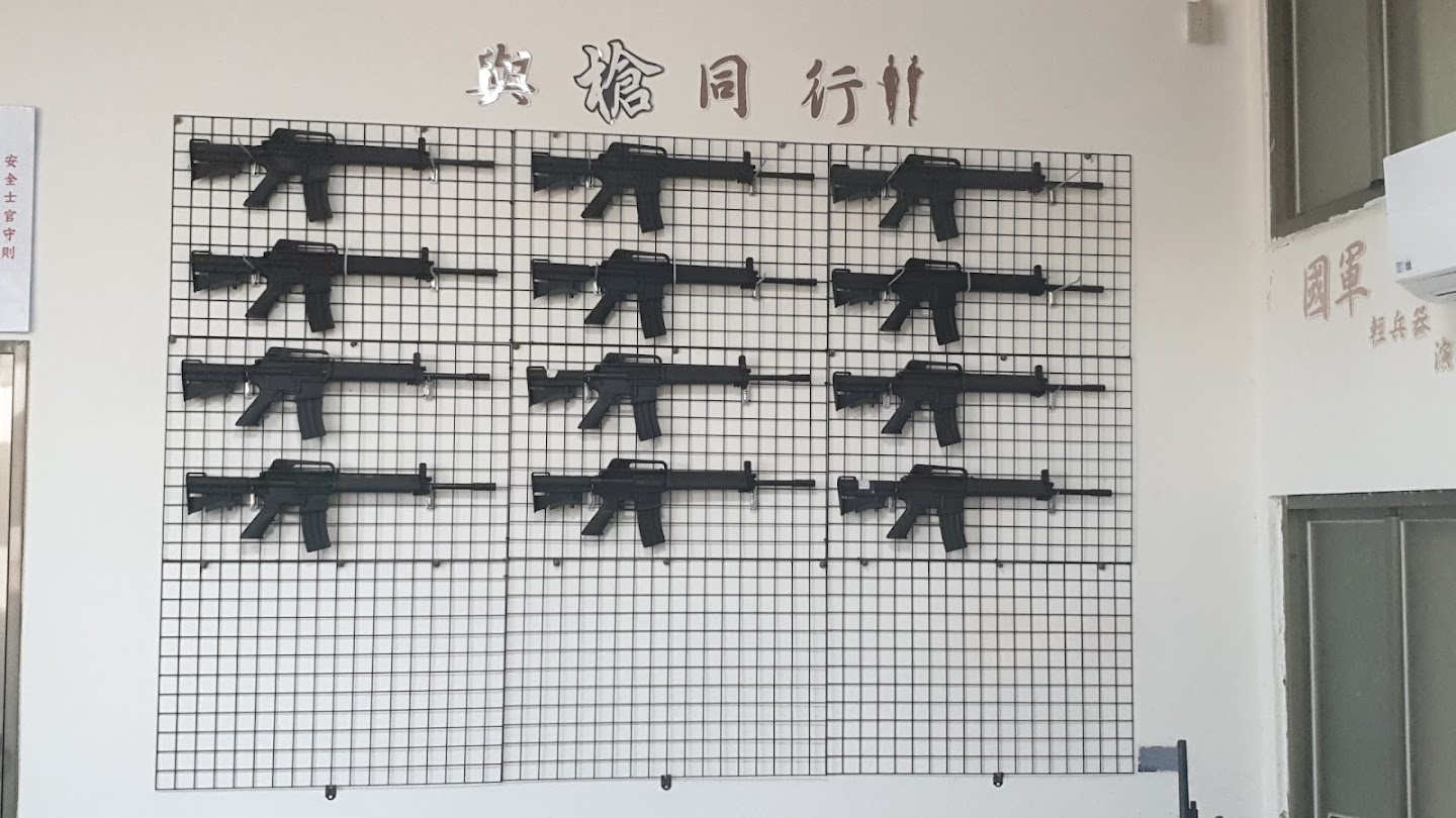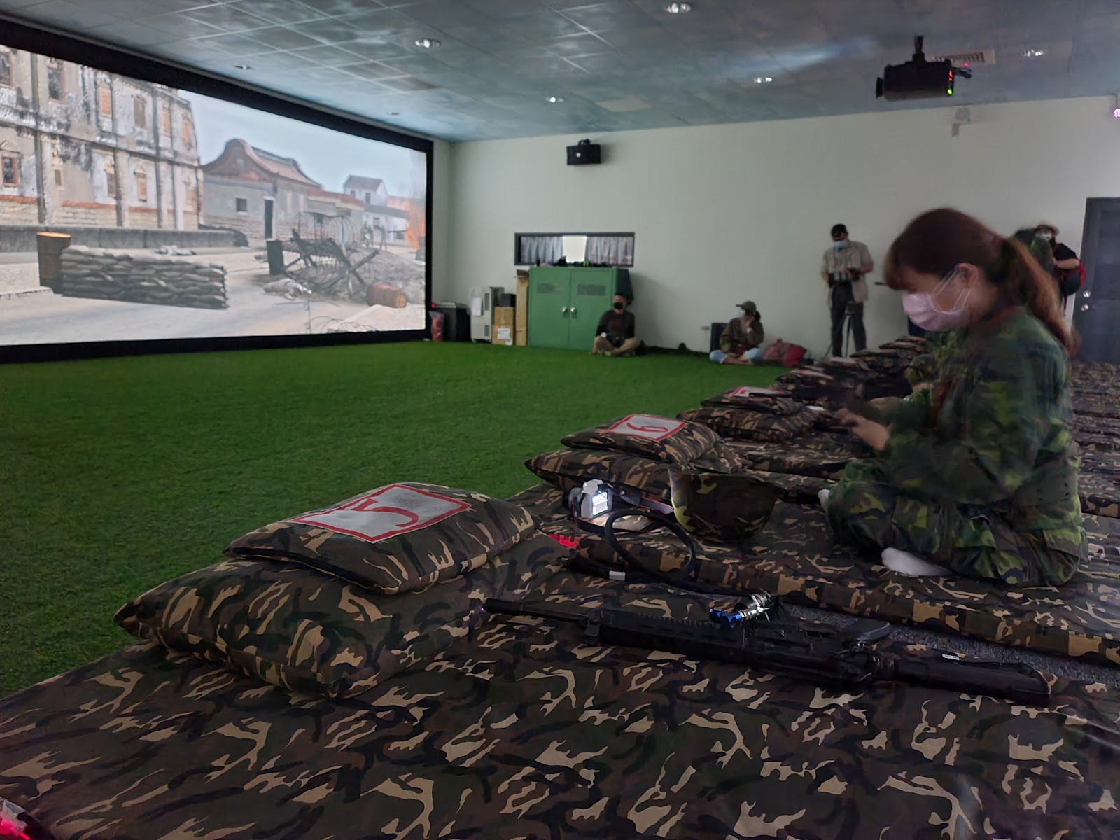 報到換穿迷彩服後,在場地外可以自行拍照,之後在室內選擇步槍或手槍,站在台上看著正前方的相機,拍個人照(用在打靶成績上)。