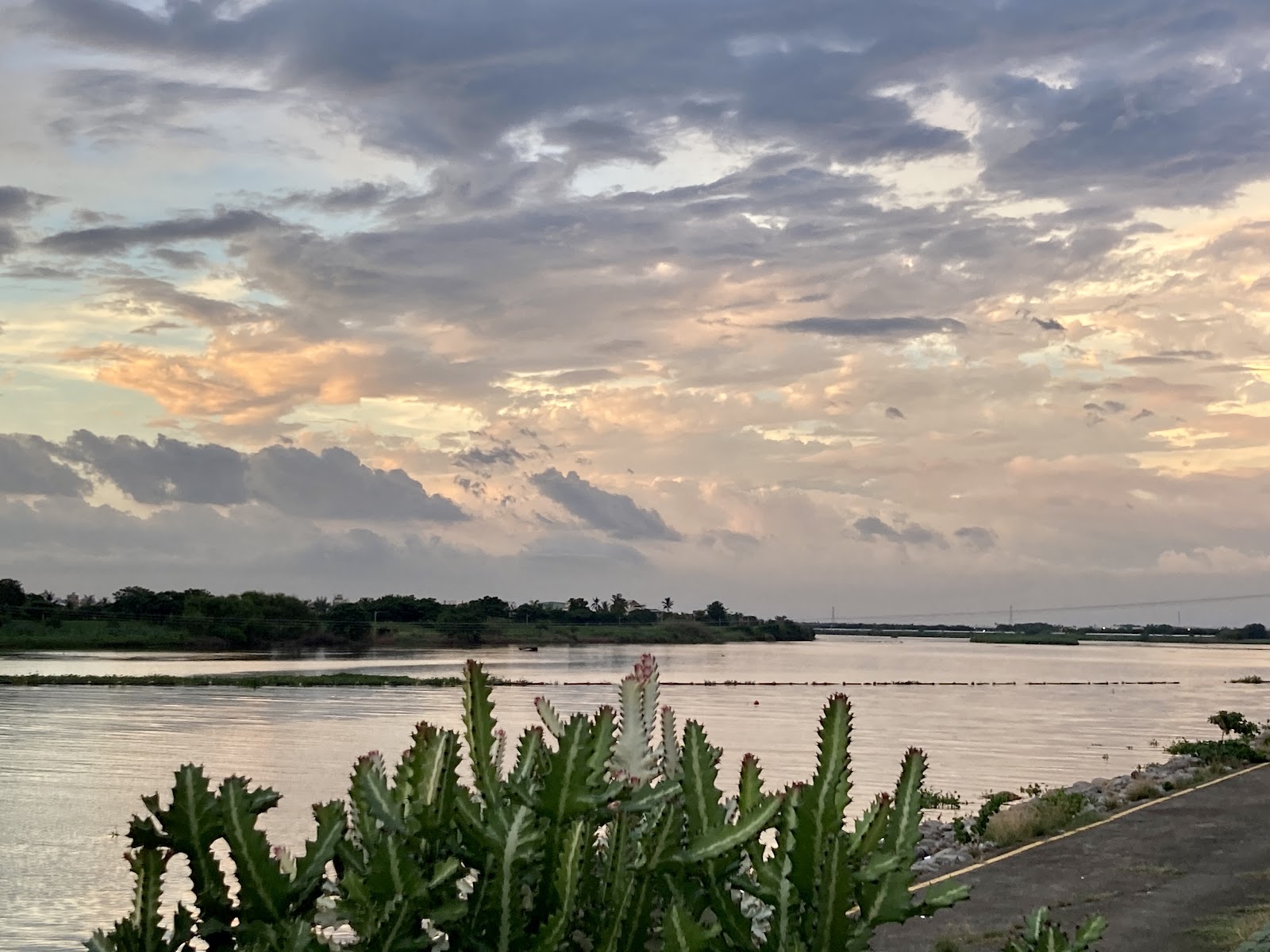 爬上河堤走路,東港溪連結出水海域,一片水光瀲灩,海天一色,心都寬了。