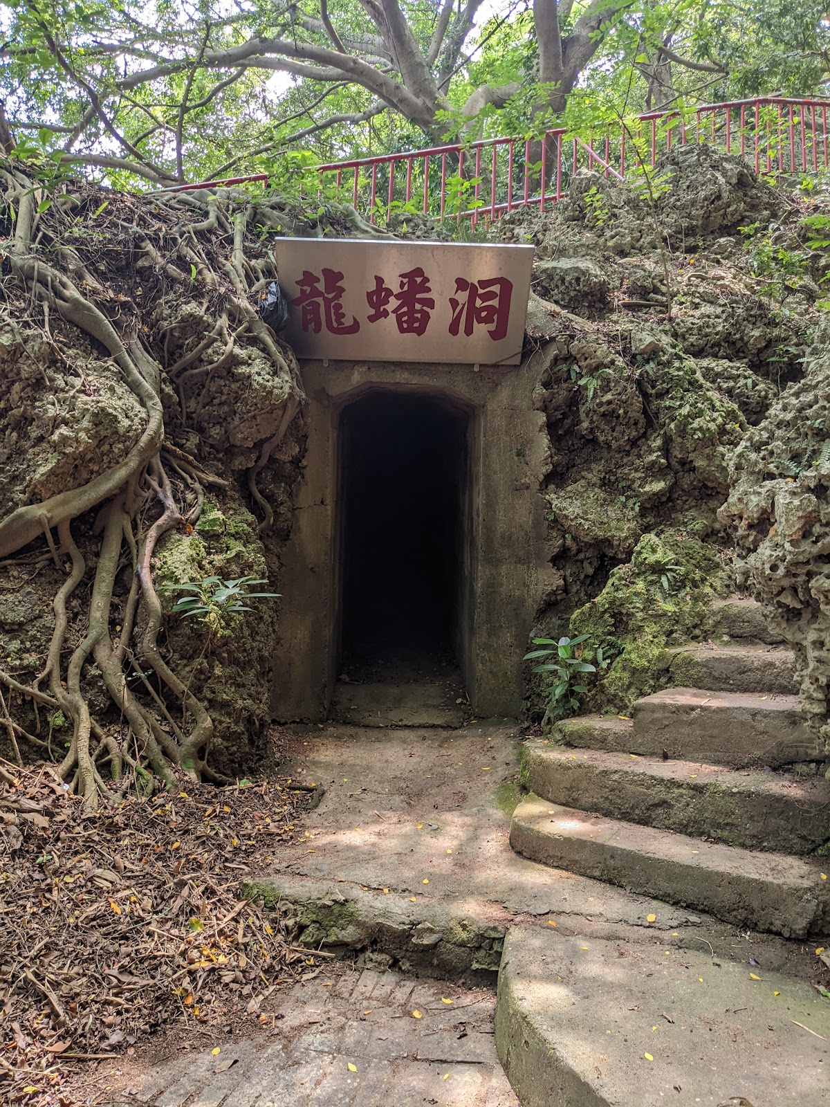 寺後「龍蟠洞」為二戰日軍挖掘的戰備坑道,全長原達15公里,現存遺跡與碉堡錯落珊瑚礁岩間,形成「地底長城」與佛寺並存的特殊地景。