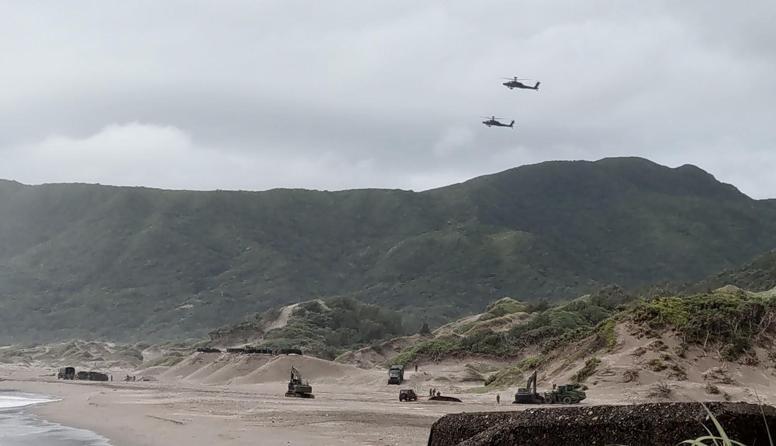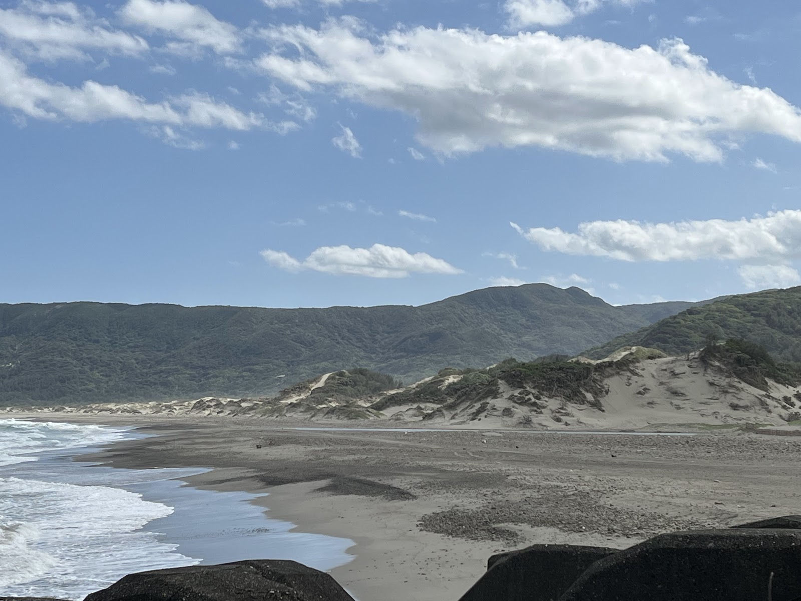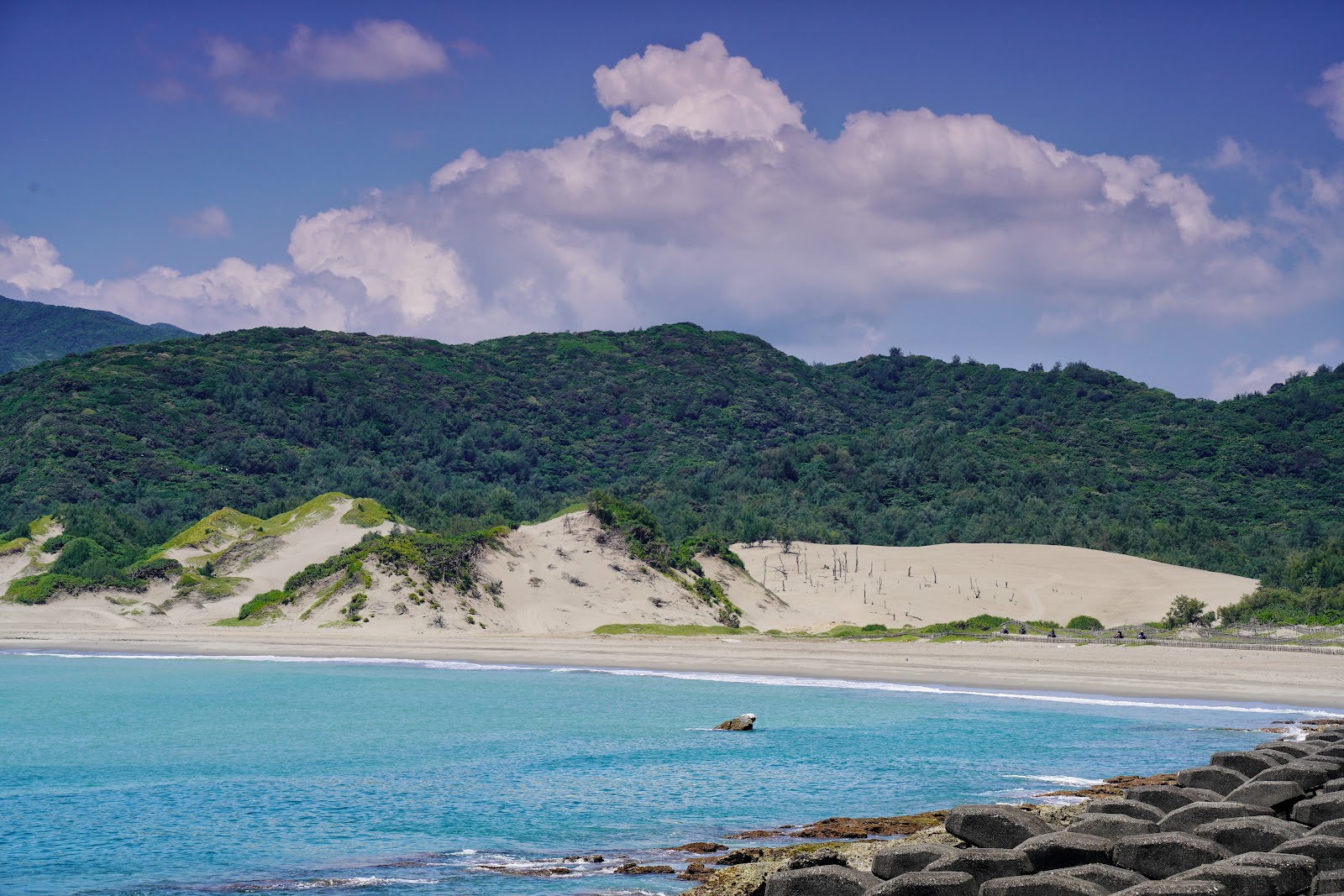 被強風吹拂而成的沙灘,有如沙漠般的景象,沙丘持續向山坡蔓延,呈現出東北西南走向的紋理,可能代表這邊長年吹的是東北風,不知道這附近的居民會不會常常會遇到風飛沙,看起來防風林蠻重要ㄉ
