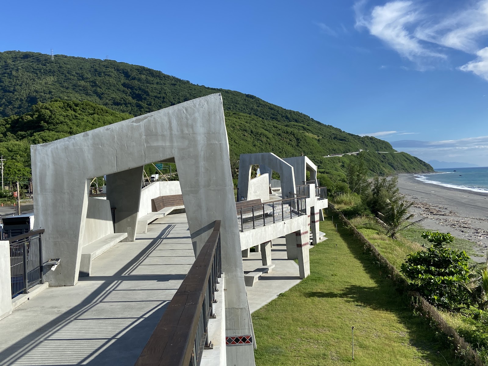 真的要給設計這個休憩區的人一個掌聲!這有稜有角、形狀不規則的觀景台怎麼拍怎麼美,一眼看出去綠的綠藍的藍,搭配上水泥建築的簡潔設計,一點也不突兀。從南迴開過來這麼久,第一個遇到的休憩站就這麼優質,真的很令人期待接下來的旅程,在建築的陰影保護下,海邊的陽光曝曬也就沒那麼恐怖了,絕對值得停下來好好欣賞 ❤️