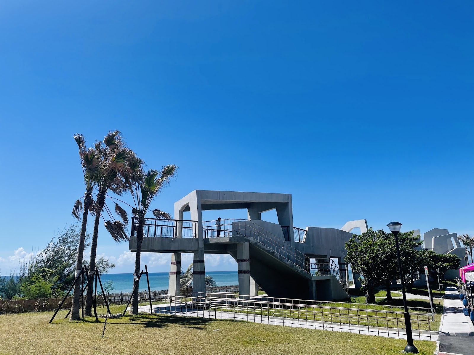 很舒服,可以遮陽看看海,立體幾何的長型走道,很好拍照。