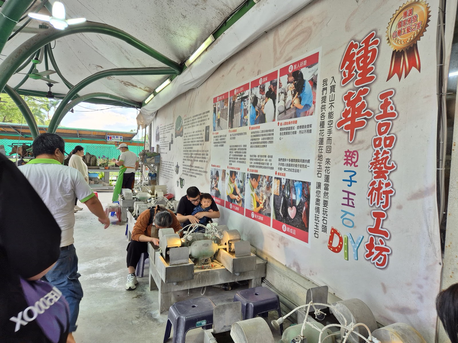 蠻好玩的玉石DIY行程,先選玉石,有台灣玉、台灣雞血石、花蓮金瓜石、太魯閣玫瑰石、台灣墨玉、國外進口玉石,服務人員先介紹各種玉石,可挑選喜歡的石頭和形狀,選好就不能更換了,接下來由師傅教你怎麼磨,給我們用的磨石機很安全、不會受傷,磨得差不多,師傅會幫忙打洞和打磨,師傅都很有耐心地解說,師傅用的機器是有危險性的,弄不好會受傷的,最後再選繩結,看要做項鏈還是鑰匙圈,做完就可把美美的玉石帶回家。 現場也有賣手鐲和玉石可以選購,還不錯,蠻有意思的!