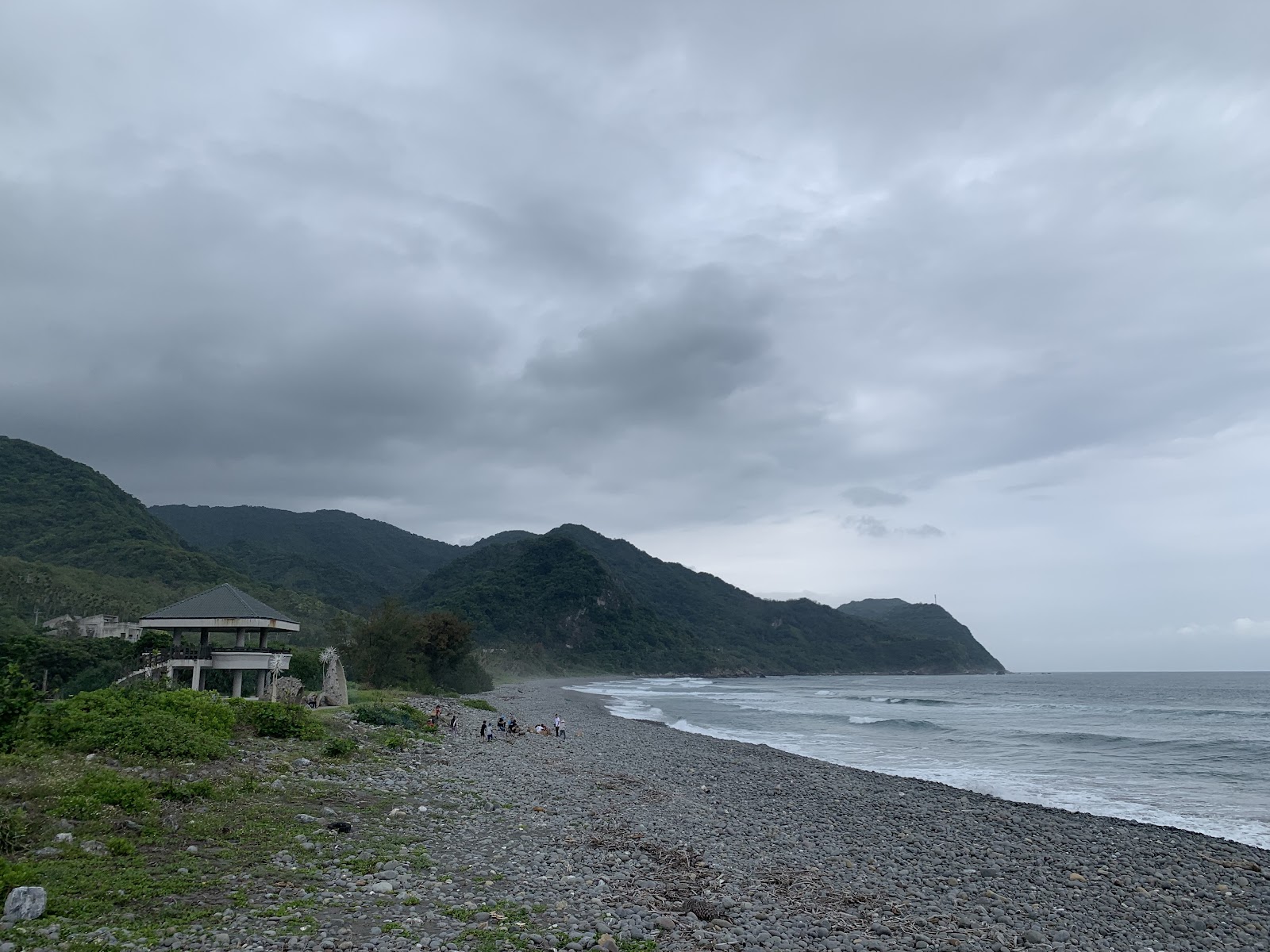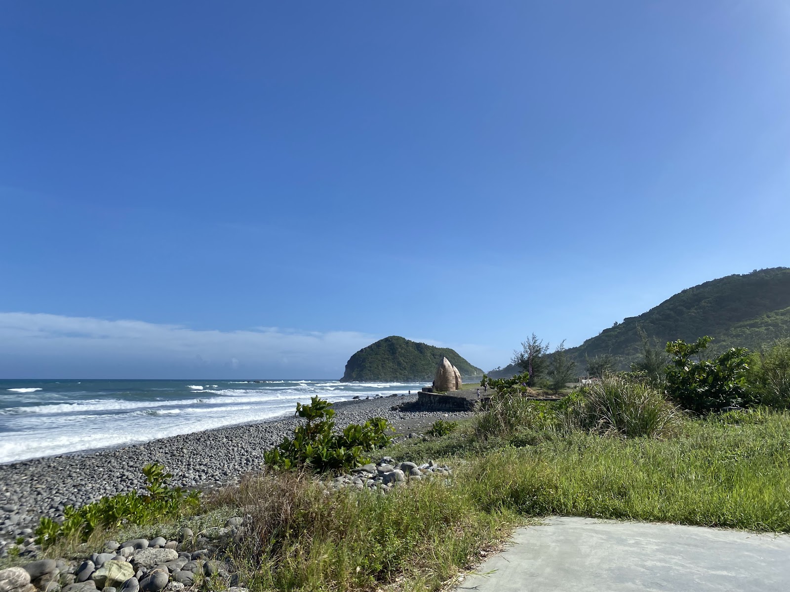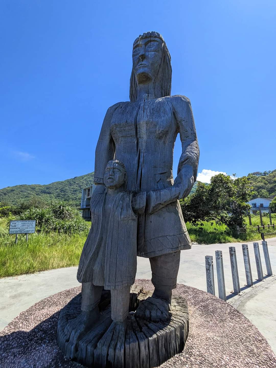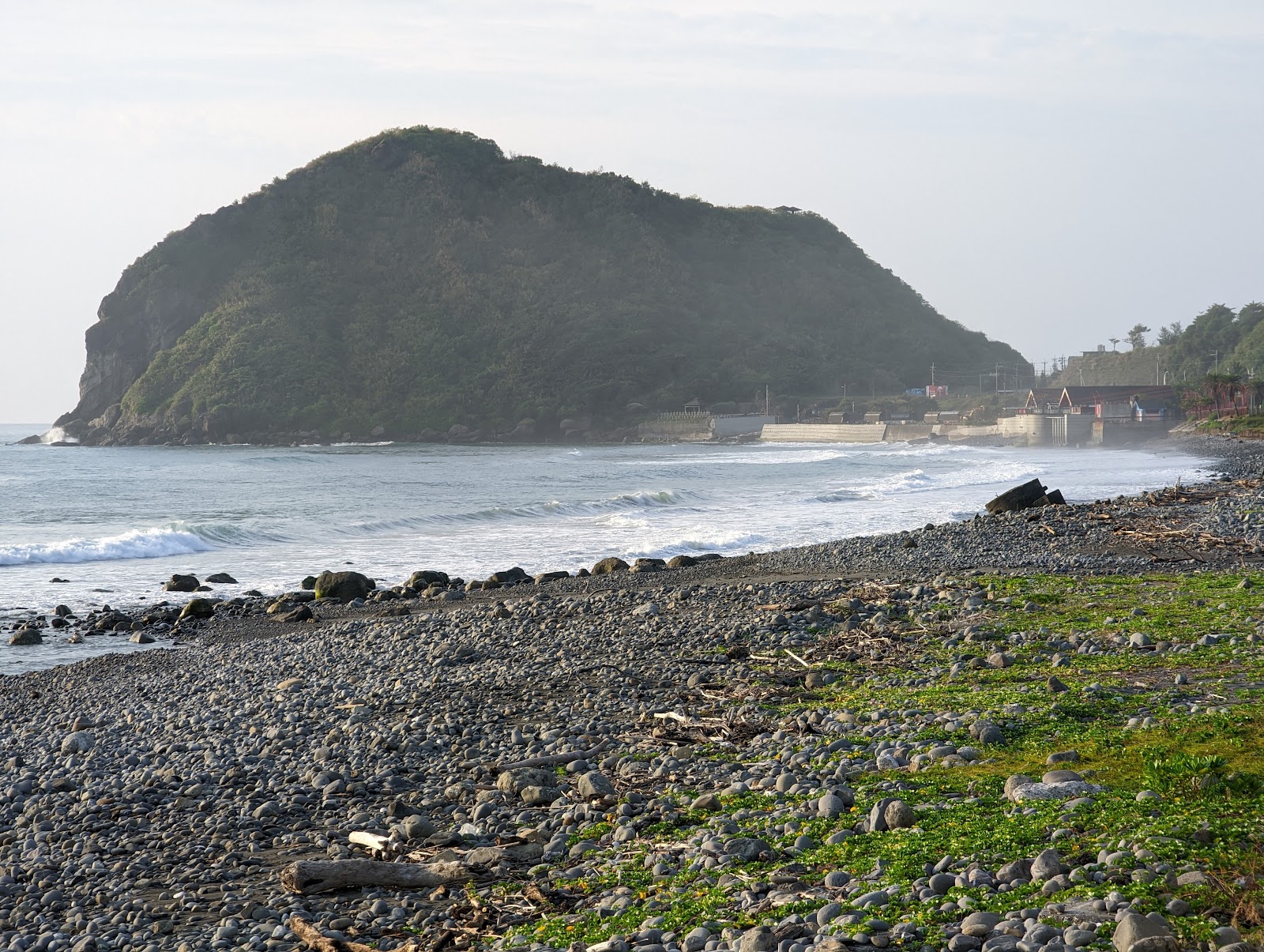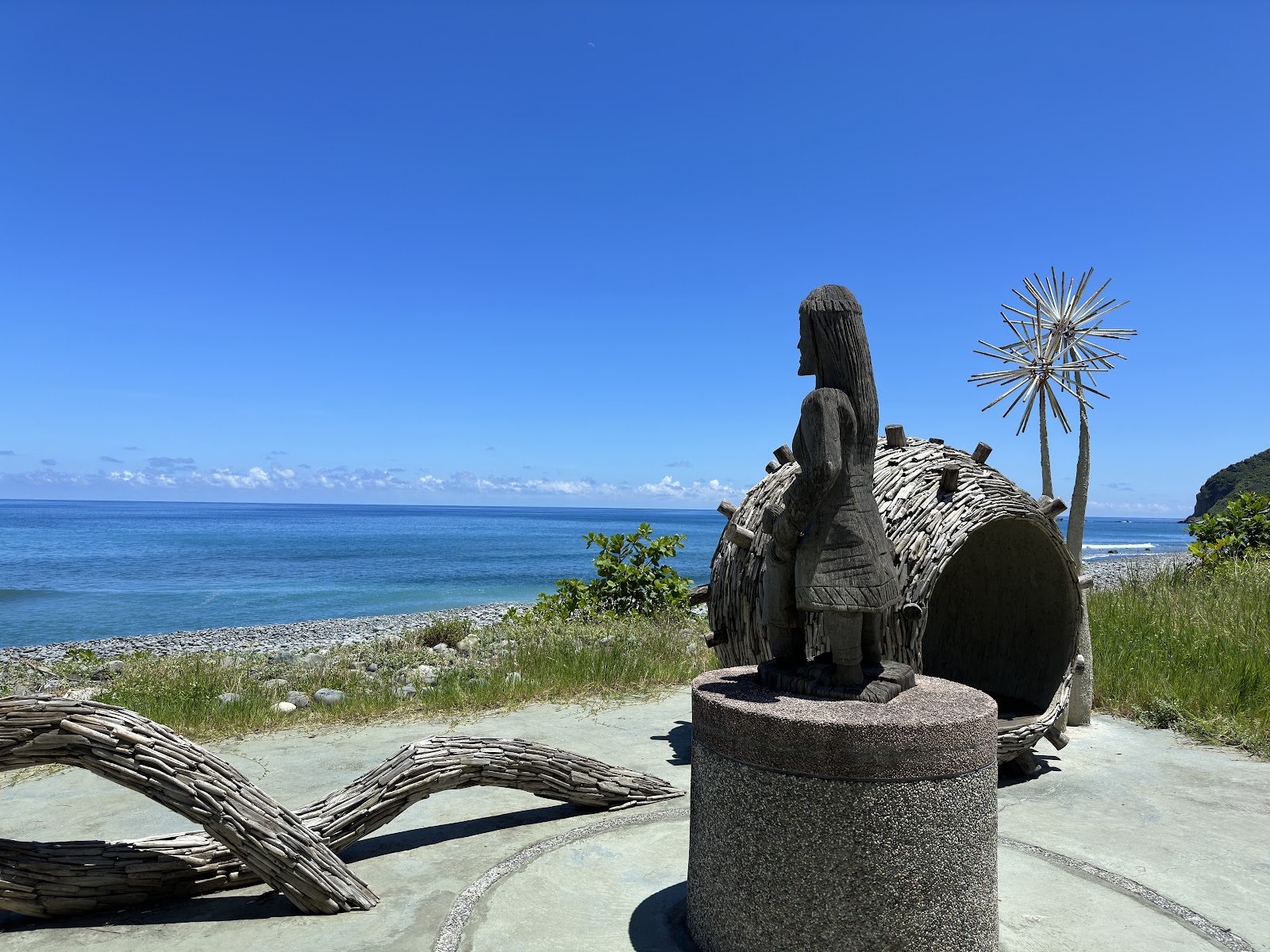 應該算是個小秘境,入口處是一排木造ㄇ字型的裝飾物,石造兩層涼亭旁佇立了一對木頭雕刻的母子,面對大海,不知翹首盼望著什麼,彎彎的黑沙灘海灣,兩頭都是美麗的山脈與太平洋交界。