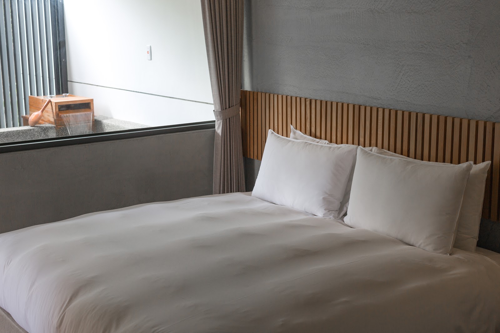 房間是工業風的簡約設計,一進門就能聽到外面大自然的蟲鳴鳥叫,採光也好,搭配聆聽山林溪流的溫泉非常愜意。(P. S. 床很舒適,彈性剛好。)