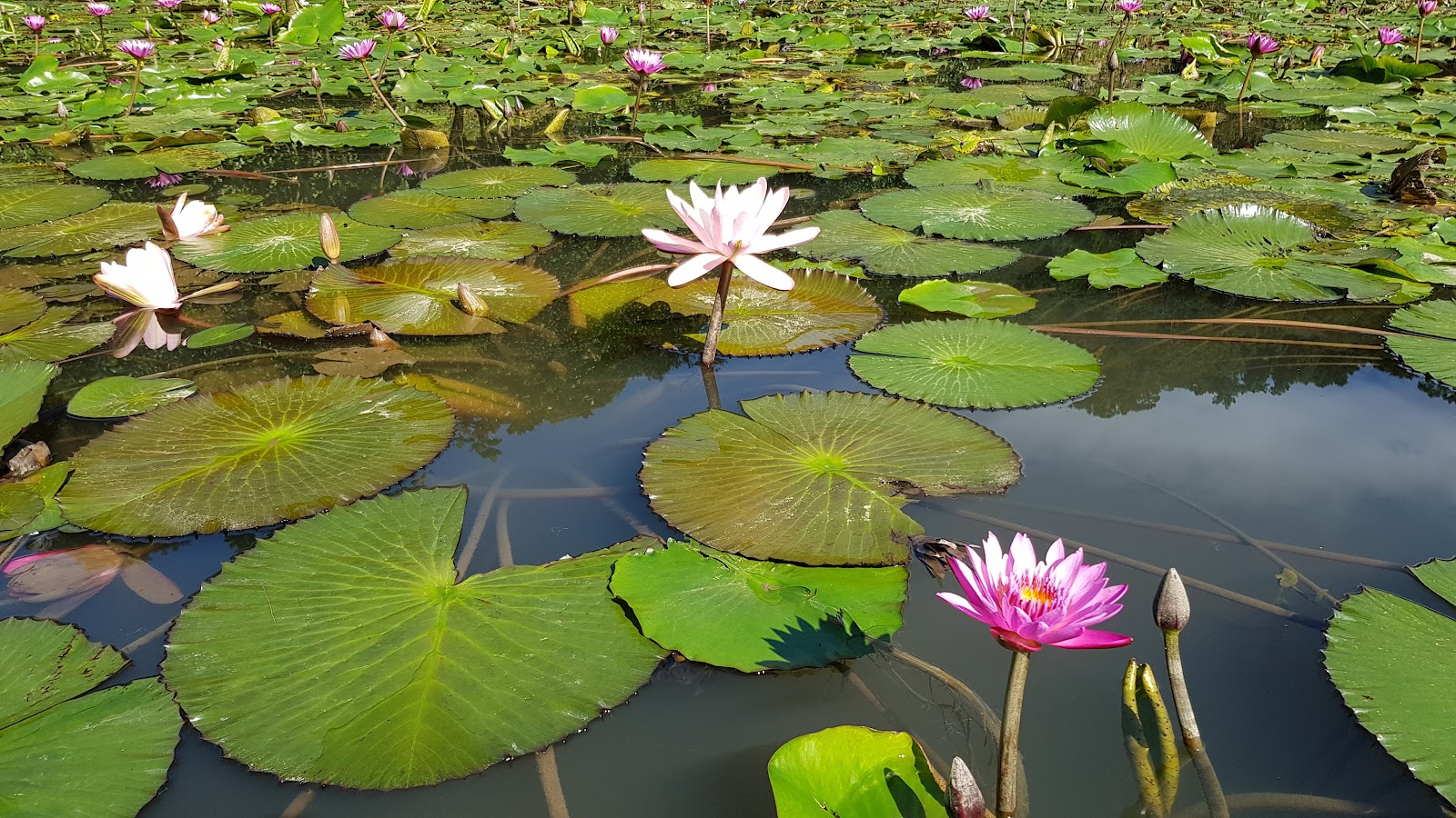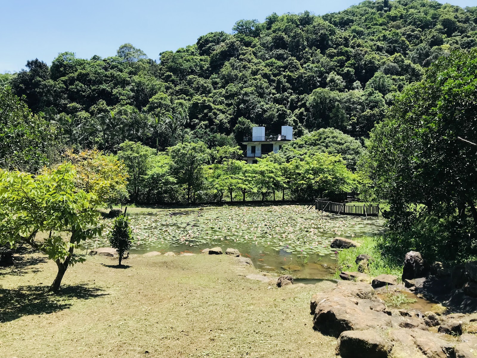 每年的 6 到 9 月是賞 蓮花, 荷花的好時機. 我們來得也算 對時. 這裡雖然 名為 荷花池, 但依照葉子 平躺在水面上來看, 這應該是 睡蓮. 但不管是甚麼, 都一樣很漂亮, 數大就是美. 趁著早上, 拍下 魚兒悠游的 在浮萍間 游來游去的畫面, 非常療癒. 一旁還有岩石堆砌的 假山造型, 增添幾許趣味. 現在看都覺得很美, 相信 七 八月時, 一定會更漂亮.