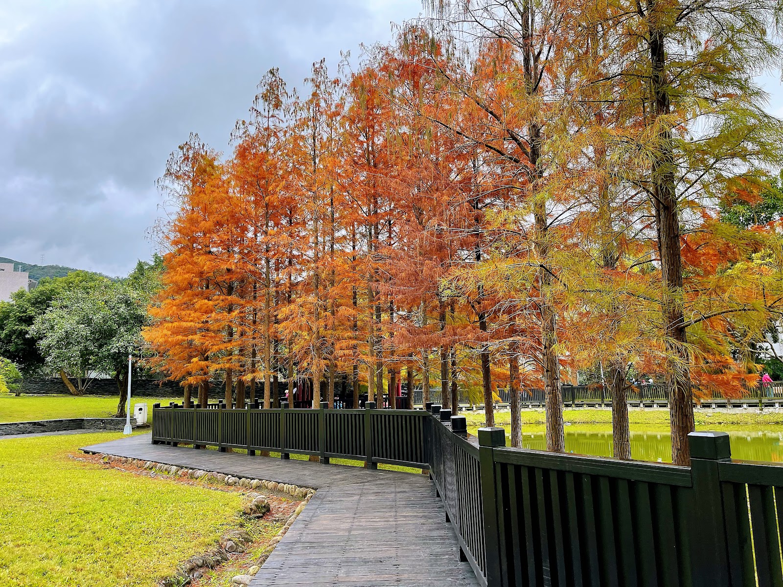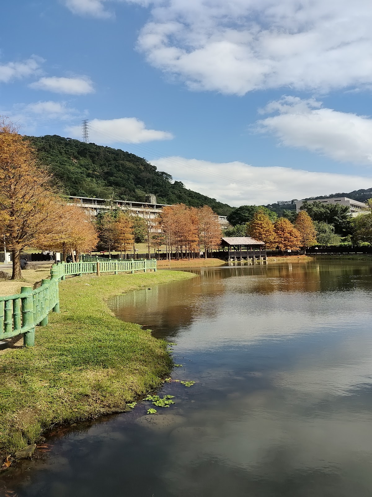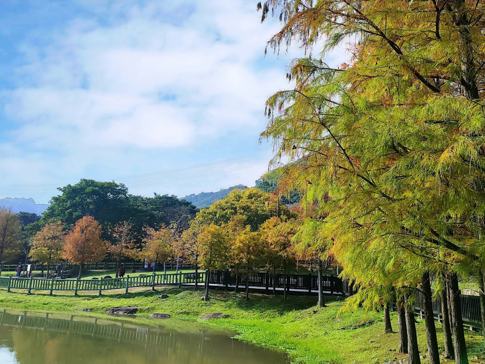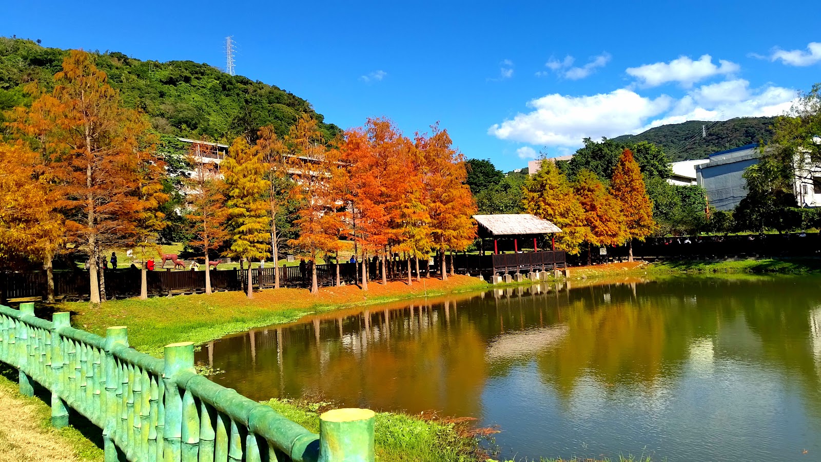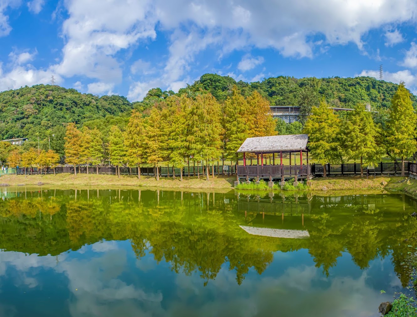 池畔落羽松群列,鋪以遍地的褐色落松及水生植物。沿著景觀池塘棧道走,一彎一景,有青綠、有金黃也有艷紅,相互鋪陳,頗富層次美感,加以乍現的藍天映襯,這景物與倒影,揉合的完美無瑕。偶然細雨輕灑,池面微有氤氳,粼粼然皺碧鋪紋,若有『波上寒煙翠』之美。