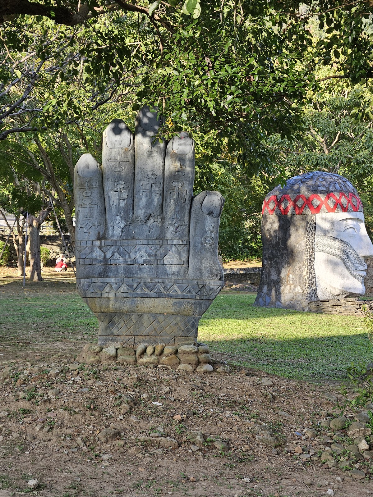 紋面、搗米、排灣族手紋(太陽與人子)、鹿群與族人母子等石雕,展現原民圖騰文化與周遭自然美景,為靜謐的景緻增添生命力與動感。
