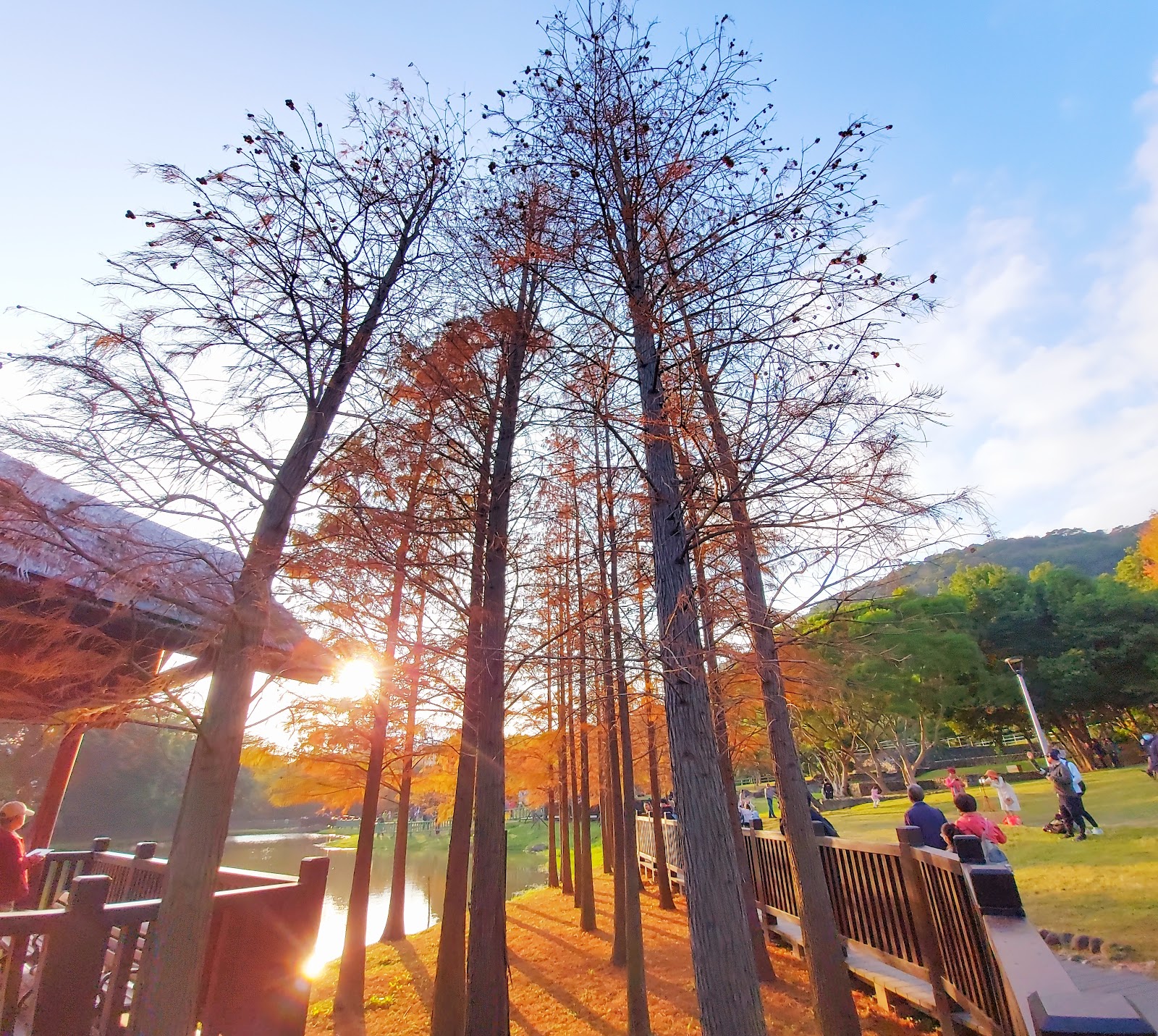 現在1月最美的就是那片環繞小湖的落羽松,景觀池旁的落羽松正值轉色期橘紅交錯,水岸倒影拍照起來極美。公園後方與故宮、至善園相連,路面平整好走,很適合週末來這裡散步放空!在暖陽下漫步,身心都被療癒了。