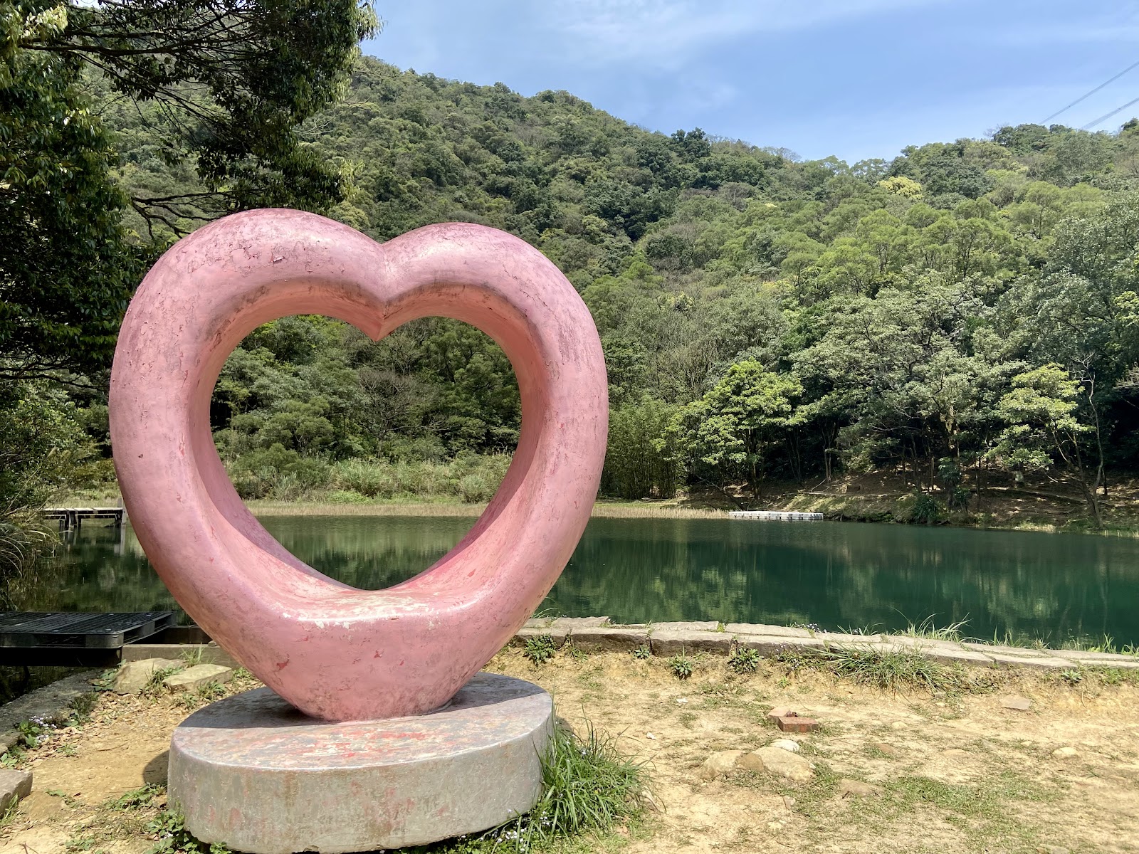 是平日而且下雨,車停外面路邊(晴天假日一定非常難停!調頭不易,因終點圍欄阻擋,說是私人土地..我是不懂如果是私人土地怎麼可能在夢湖邊立了一個大大的網美拍照點的紅色大心型?!