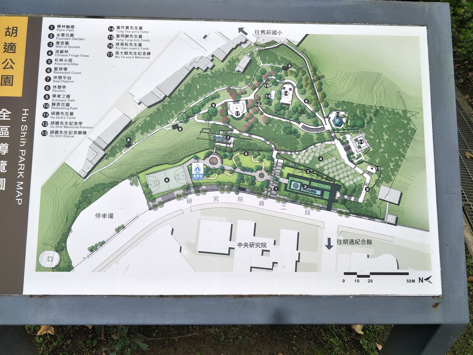 公園內紀念著胡適和其他中研院院長,有相關的紀念碑、箴言牆,公園雖不大,林蔭處不少,走起來相對舒服,公園也設計的挺美的