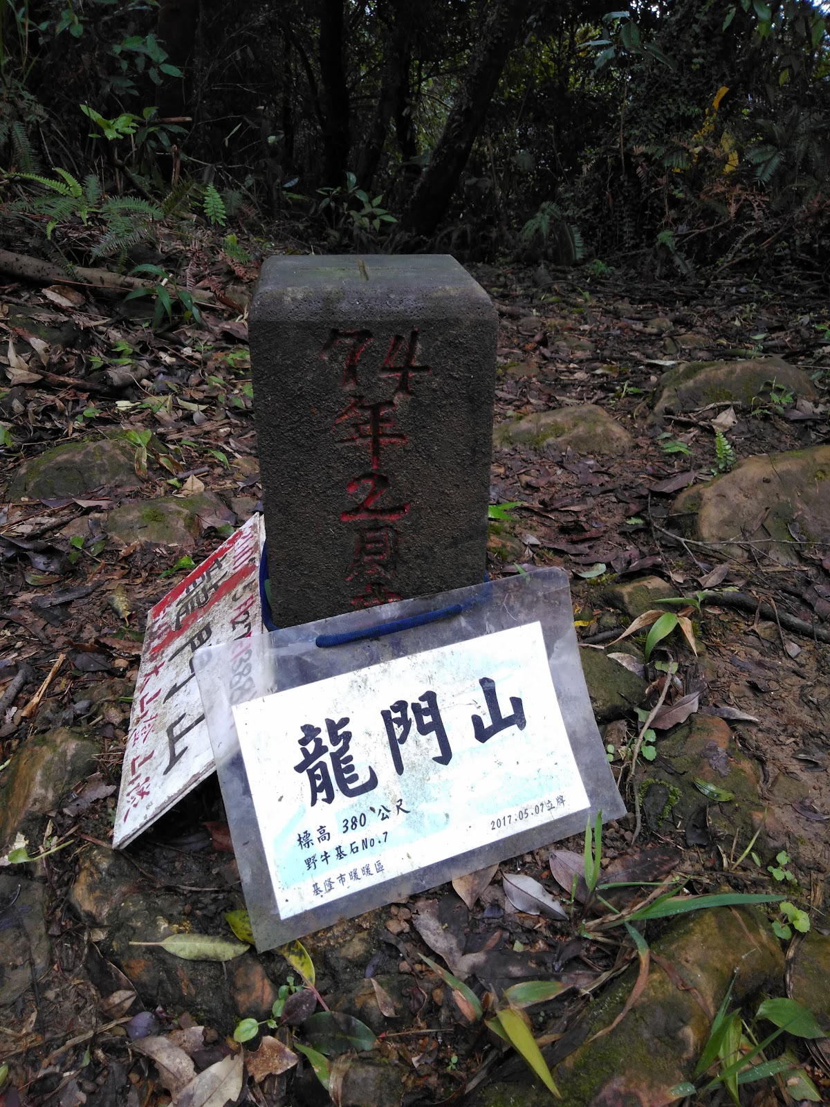 從粗坑口步道的產業道路,拉繩陡上約15分鐘就能到龍門山,從暖暖車站或四腳亭車站都有步道和山頭可以串聯走,往碇內砲台,往五分山等。山頂立有野牛7號基石,野牛當初在雙北選立基石的地點都是很有特色的山頭。