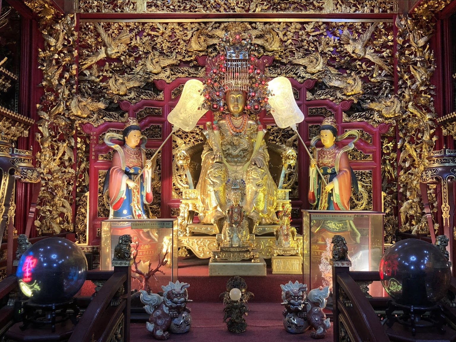 廟裡有一尊全世界最大的金媽祖神像,用純金打造全身, 高6尺3吋,黃金用量五千三百兩,聞名全省。