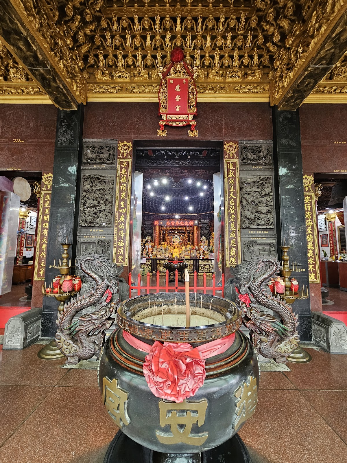 恰逢中秋連假,一圓親睹寶石珊瑚媽祖盧山真面目。據進安宮網頁記載本宮供奉媽祖主神來自十九世紀初一艘來自唐山帆船,當時為了躲避颱風停靠於北風澳(後來改名為北方澳),船員將船中的媽祖請到陸上石洞祭拜,後來唐山帆船要離開,居民請求留下媽祖神像,船長不准雙方僵持,後來擲茭杯,媽祖決定留下,這就是黑面媽祖的由來。