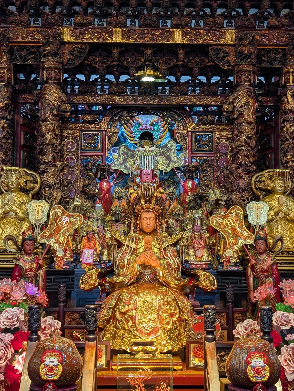 寶石珊瑚媽祖的法像、手部及令牌係由一古今中外、百年難得一件巨型桃紅珊瑚(直徑30公分、重50多斤)一口氣雕刻而成,媽祖冠冕「五鳳冠」,以寶石珊瑚枝與頂級寶石珊瑚主石交相呼應,可稱無價之寶。