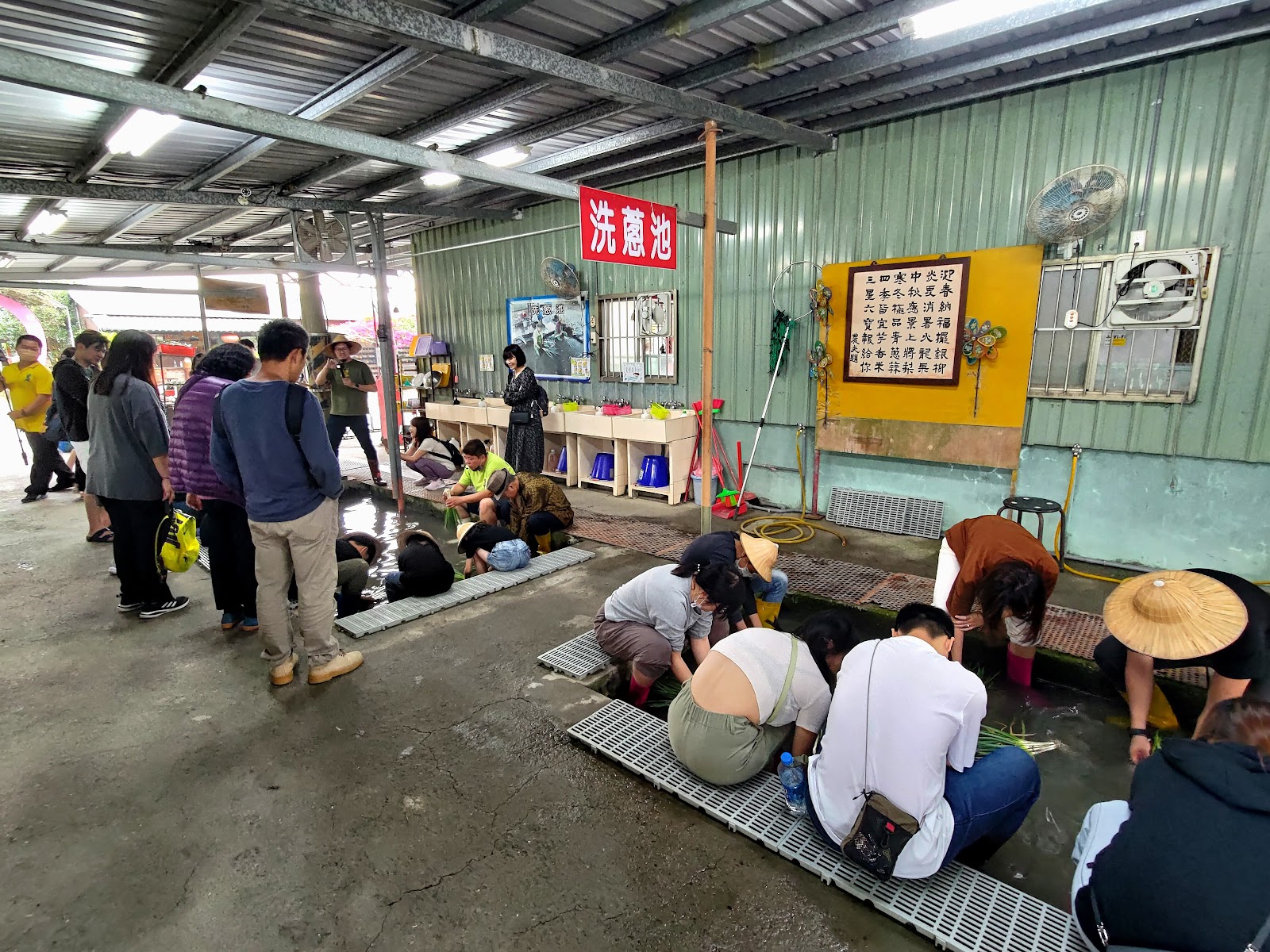 拔蔥也不怕客人多拔,因為他們長期在地經營,應該有很多塊地。導覽員也會在回程時,貼心的幫客人把雨鞋沖洗乾淨,再下池去洗蔥。蔥多到我們洗不完,只能放著給店家處理了。洗完一批立刻整池,換乾淨的水,也是讓人蠻安心的事情。