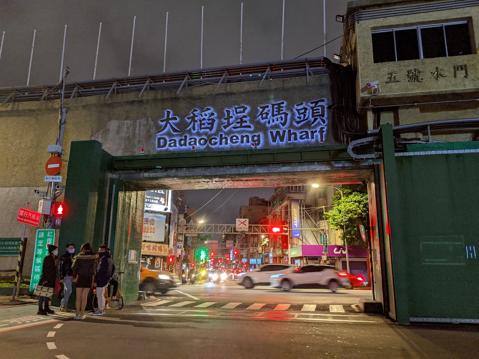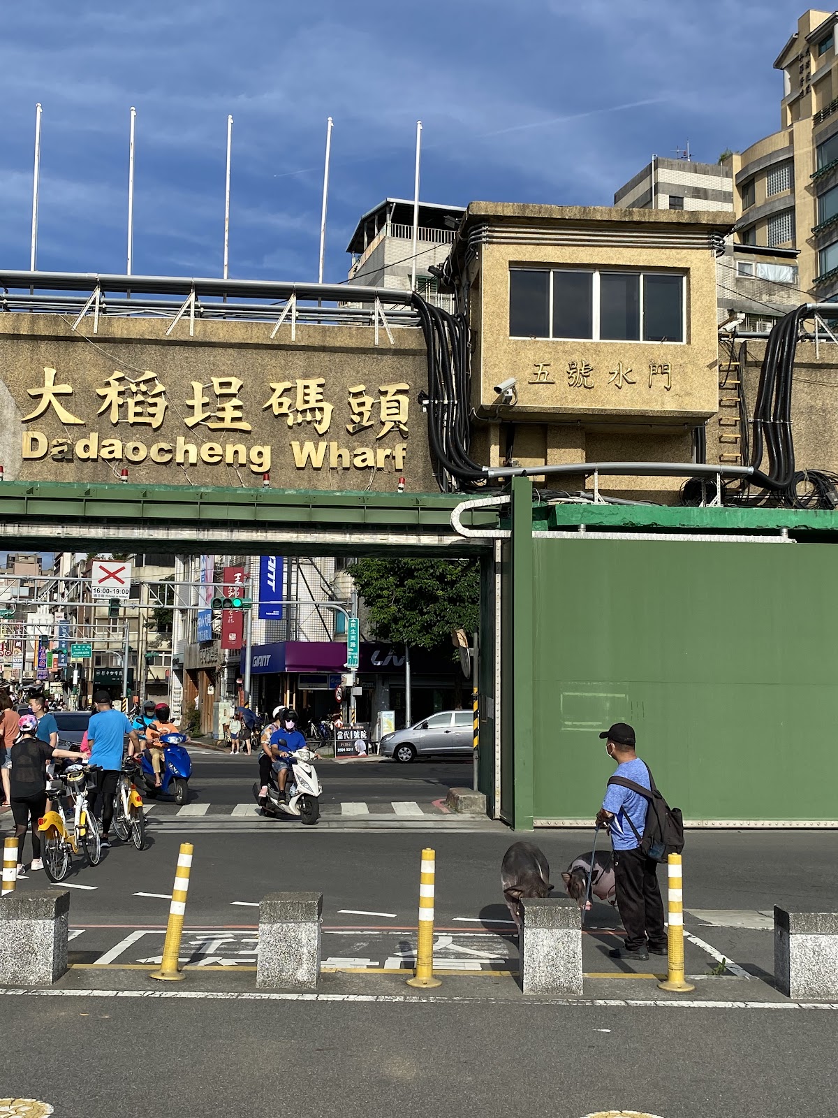 2024/8/10造訪,通往大稻埕碼頭的其中一個入口,水門上有大稻埕字樣,旁邊牆上還有馬賽克磁磚貼出來的早期船隻圖案很好看~