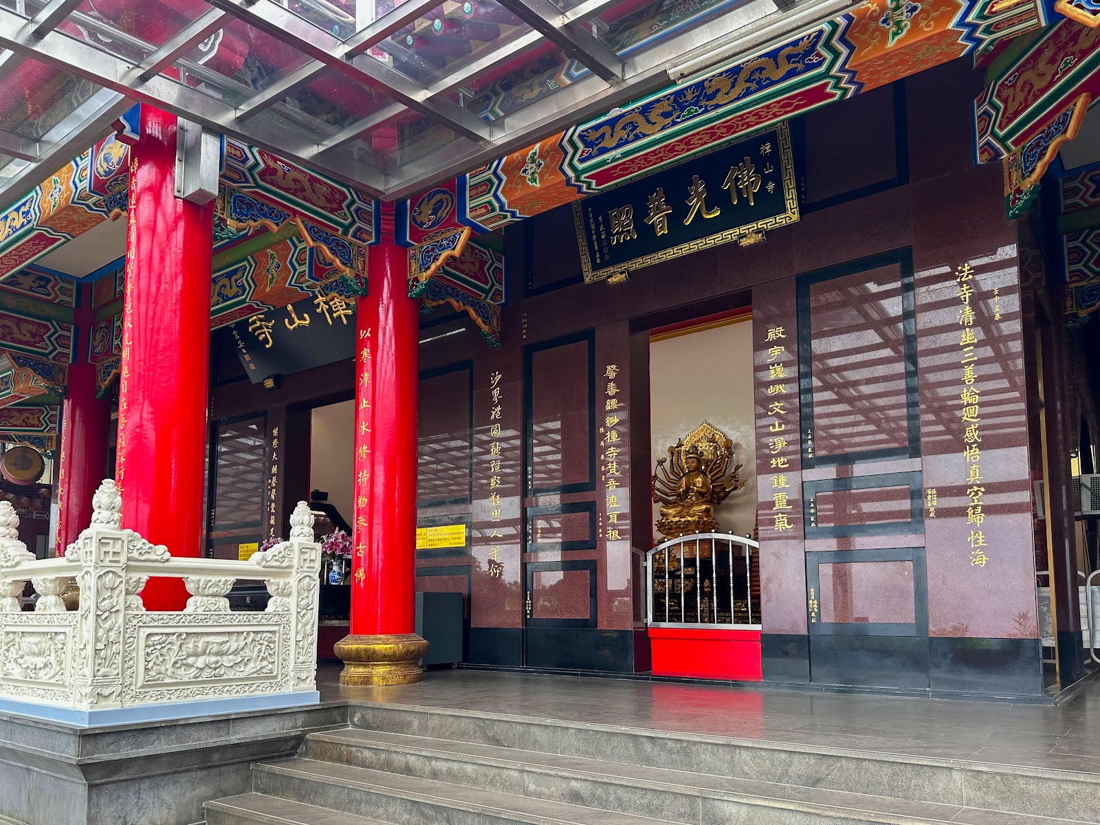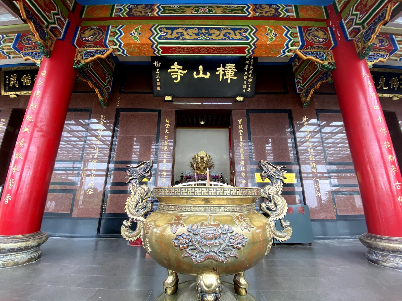 樟山寺風景好,飛龍步道上的終點休息好地方,有免費的茶水供應,洗手間整潔乾淨,上香祈福的人多,寺外路邊可停車,可廻轉,車位不多,搭貓纜或小巴上山較方便輕鬆,從政大校園內走飛龍步道上來約1個小時可到,三五好友一起相約走走逛逛很適合