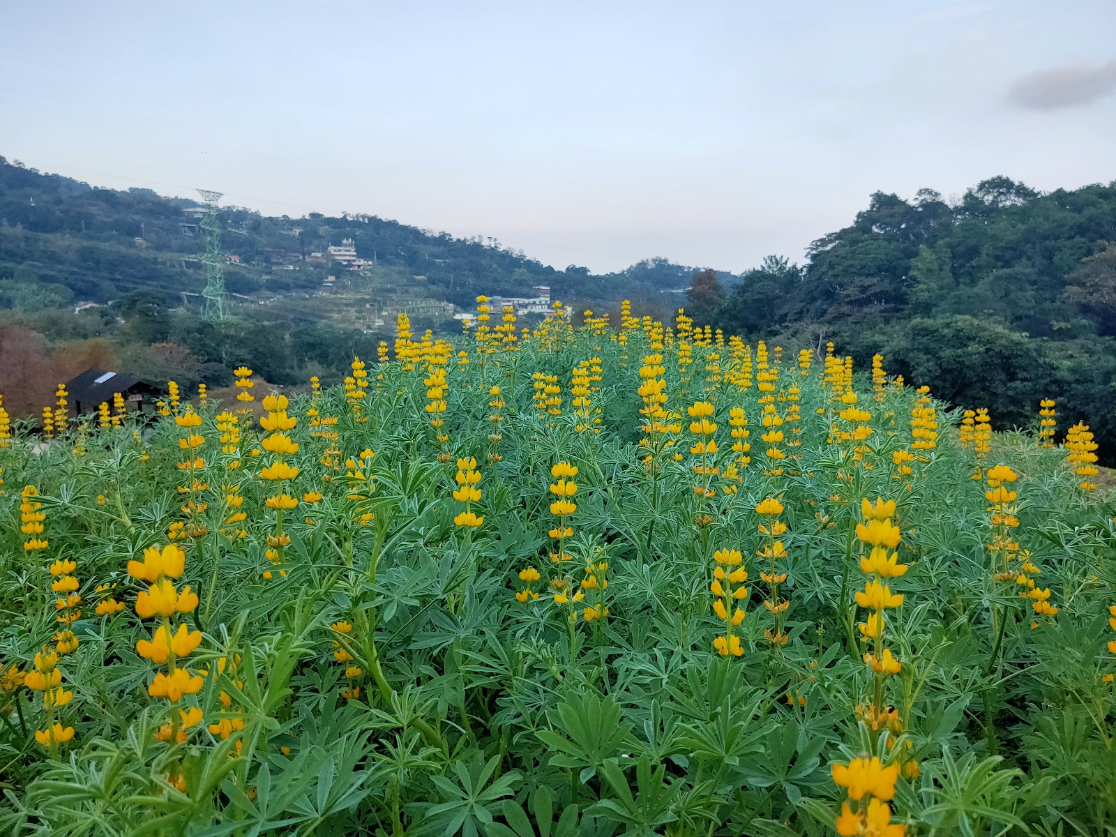 盛開的魯冰花海🌼。大片金黃色花朵隨風搖曳,彷彿替山坡鋪上一層溫暖的地毯,畫面十分療癒🌻。