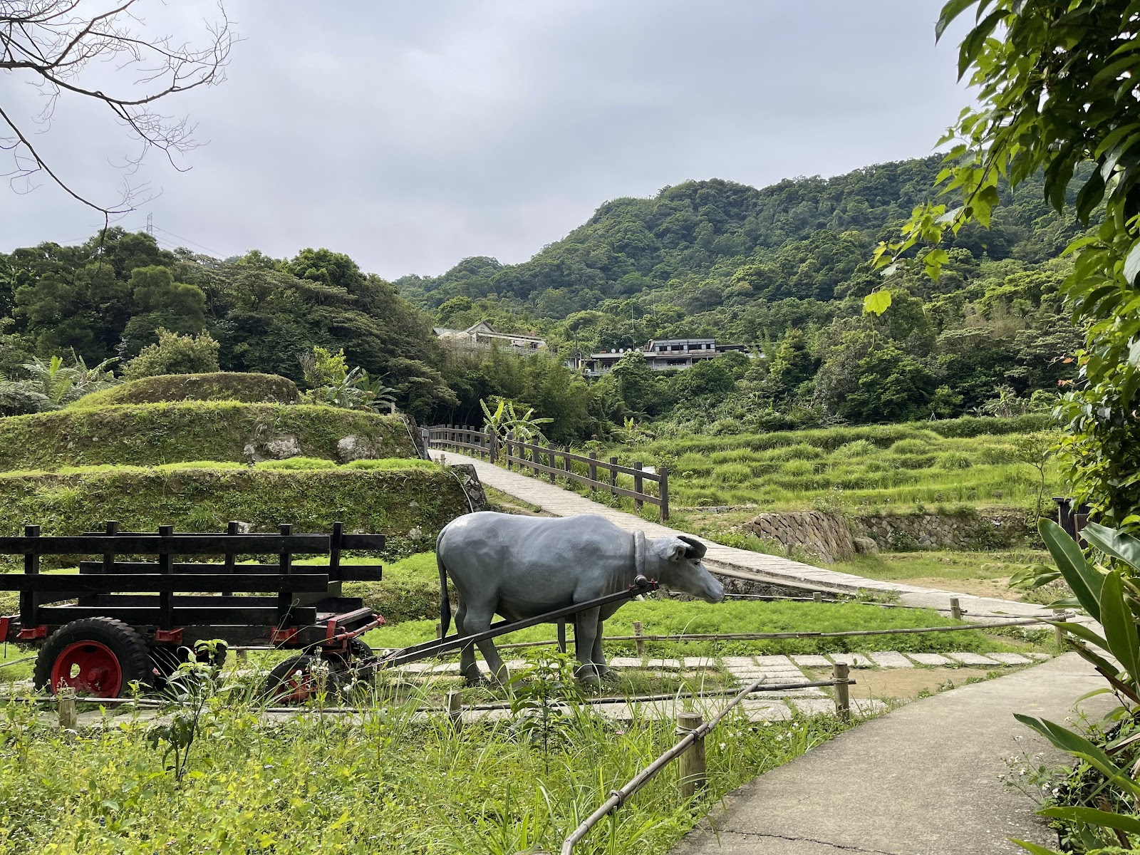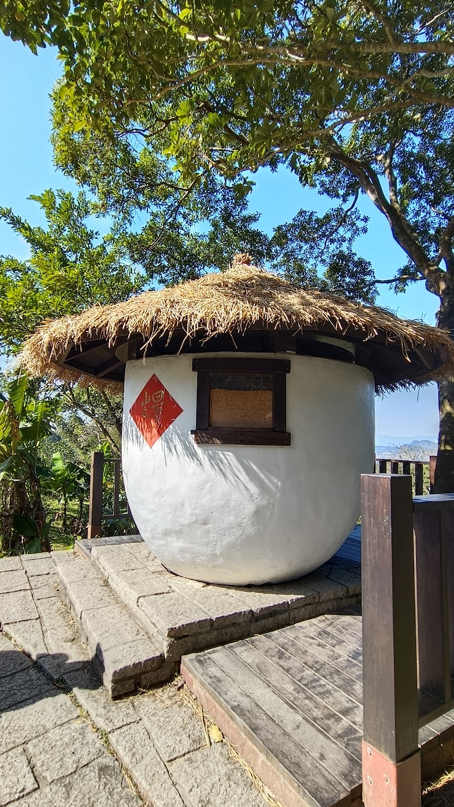 水池不大繞池一圈後繼續往前走,來到了兩座旋轉穀倉,圓滾滾造型相當可愛,也傳達農村意象,不過穀倉已改成休憩空間。一邊往前走一邊看山景,累了就在路旁椅子休息,唯一缺點是步道遮蔭不足,還好樟樹步道並不長,大約三十分鐘即可走完。