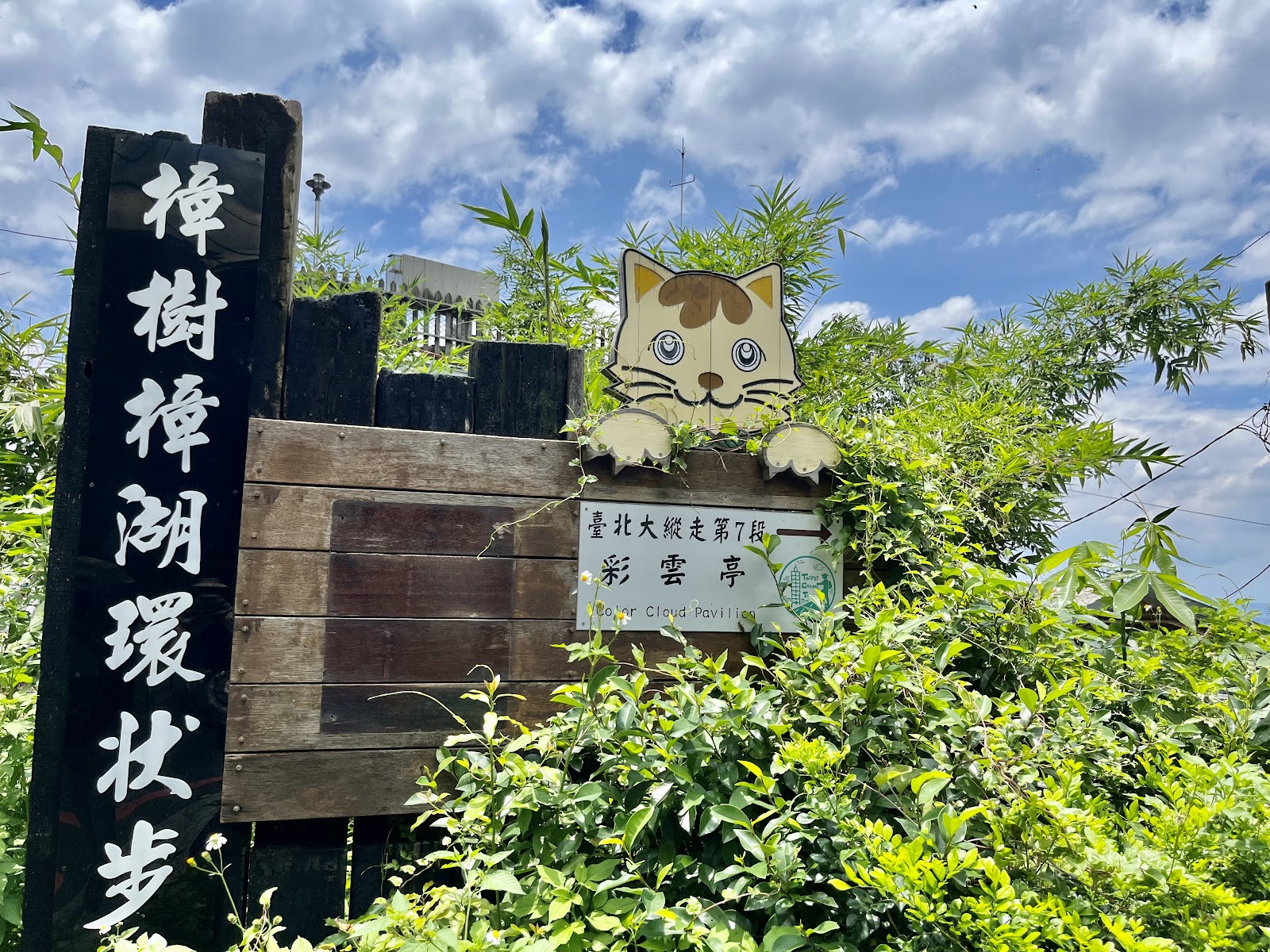 本次來訪是由樟樹跟樟湖兩步道組成的環狀步道,搭乘貓纜是到貓空最方便的方式。走出纜車站依循指標很快就可看到入口,沿著平坦乾淨石板路走,不久就來到了彩雲亭,雙層結構觀景台,前有一明鏡池,水池中有一水牛塑像,此為步道中最大人工造景。