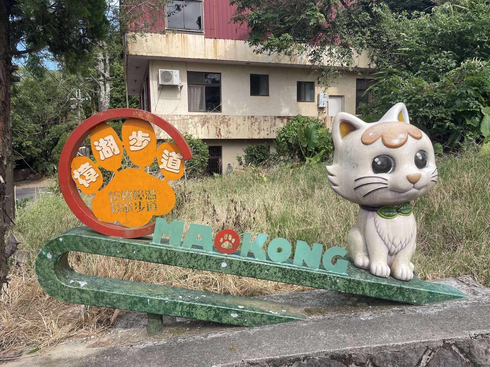 走回主線水泥步道,才知剛那段路是鄰近聯絡步道。樟湖步道上設置多處發聲設施,打造成音律廊道增添行走樂趣。順著路再往前,稍有樹蔭避曬走來涼快許多。來到一岔路口,一條向上一條向下,心想應該是下山,就選擇往下走。